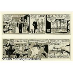 <B>Leslie Turner - Captain Easy Daily Comic Strip Original Art, Group of 2 (NEA, 1945).</B></I> Captain Easy helps two G.I. buddies, Luther and Bib, adjust to civilian life as they are about to be discharged from the Army, four months after V-J day. In 1943, Leslie Turner proved the ideal replacement for Roy Crane on the <I>Captain Easy</B></I> dailies. Turner had already been assisting Crane for six years and when he took over the strip, it was one of the smoothest transitions ever. Like Crane, Turner was a master of forceful pen work wed to atmospheric effects created on duo tone art paper. This lot of two consecutive dailies, a Saturday, dated 12-15-45, and a Monday, dated 12-17-45, present a nice chunk of the continuity. The image area of each daily is 16.25" x 4.75". The duo tone pattern remains vivid, and the art is in Excellent condition. 2 items