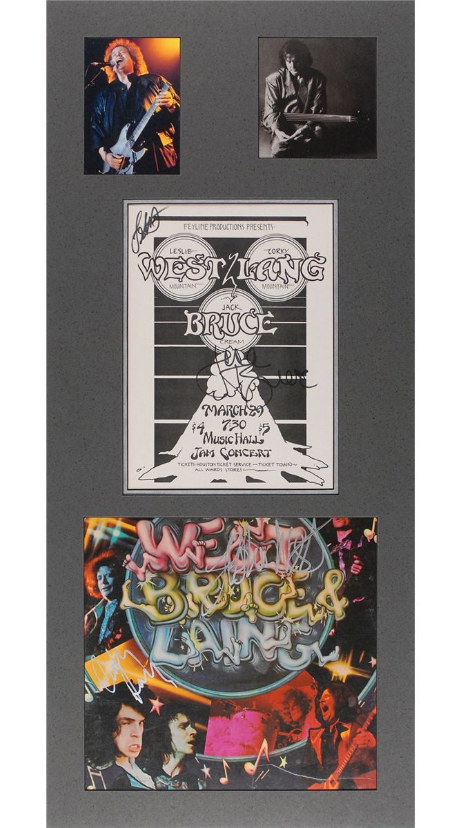 Two items: original handbill for a concert by West, Bruce, and Laing, 8 x 11, signed in black felt tip by Leslie West and Jack Bruce; and a West, Bruce & Laing album cover, signed in silver ink by Leslie West and Corky Laing. Both are matted together with two small photos to an overall size of 14.25 x 32. In fine condition. Accompanied by a certificate of authenticity from Rick Barrett.