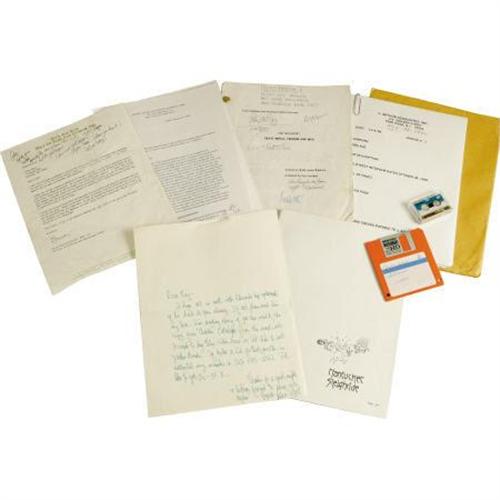 <B>Leslie West Mini-Archive.</B></I> Includes West's personal copy of the <I>Thunder and Mud</B></I> script, signed by the singer-songwriter on the cover in blue ballpoint; a letter to West from the Rock and Roll Hall of Fame and Museum with handwritten notes by West in black ink; a 15-page recording agreement dated February 10, 1999, and signed by West on the last page in black ink; a Nantucket Sleighride program book with lyrics by West; a one-page letter handwritten and signed by West in green ink; and a 28-page transcript of an interview with West from October 28, 1999, with the original cassette recording and a copy on floppy disc. In overall Very Fine condition.<BR><BR><b>Shipping:</b> Books & Catalogs (<a target="_blank" href="http://www.heritageauctions.com/common/shipping.php">view shipping information</a>)