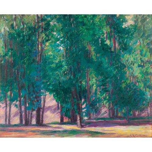 Lester A. Gillette (American, b. 1855), "Majestic Forest in the Colorado Mountains", c. 1920; oil/board, 20" x 24", signed; titled verso. Gillette worked in Topeka, Kansas. He painted landscapes and harbor scenes. He was a member of the North Shore Artist