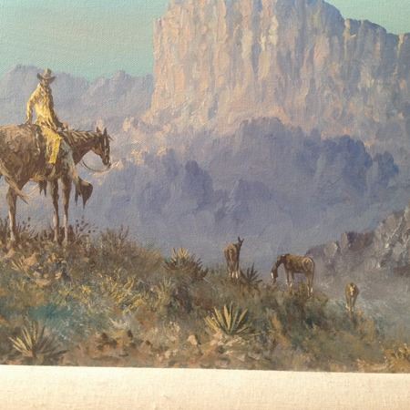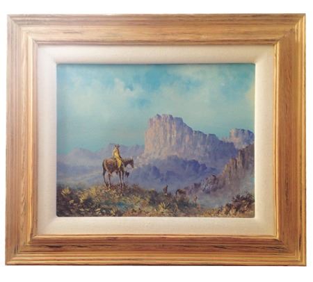 Ca. 1990s, Signed oil on canvas depicting a landscape and a cowboy on a horse near Sedona Bluff. Good condition. 20" x 16" (29" x 25" framed)