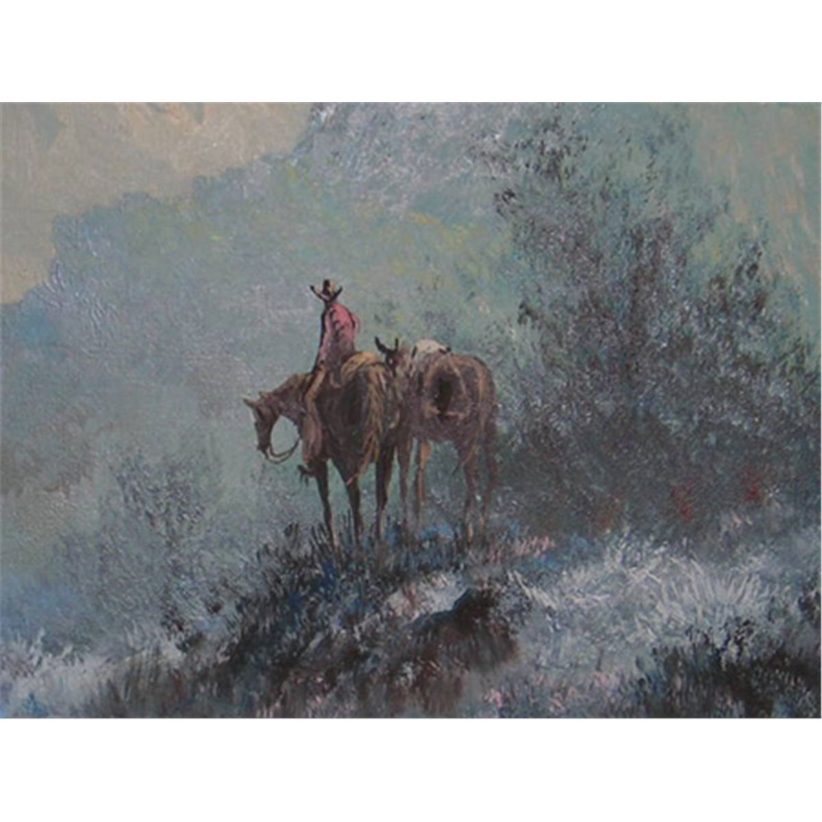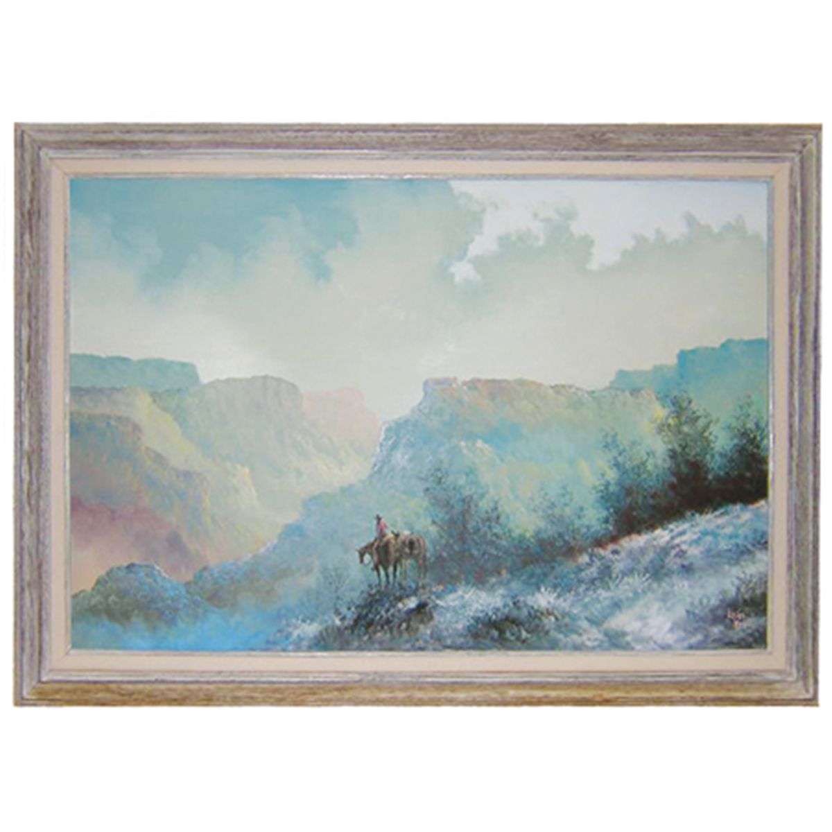 1980s, Signed original oil on canvas depicting a rider on  horseback leading a mule descending into a  canyon.  The artist's work hung in the White House  during the Regan era; retail- $1500. 36" x 24"