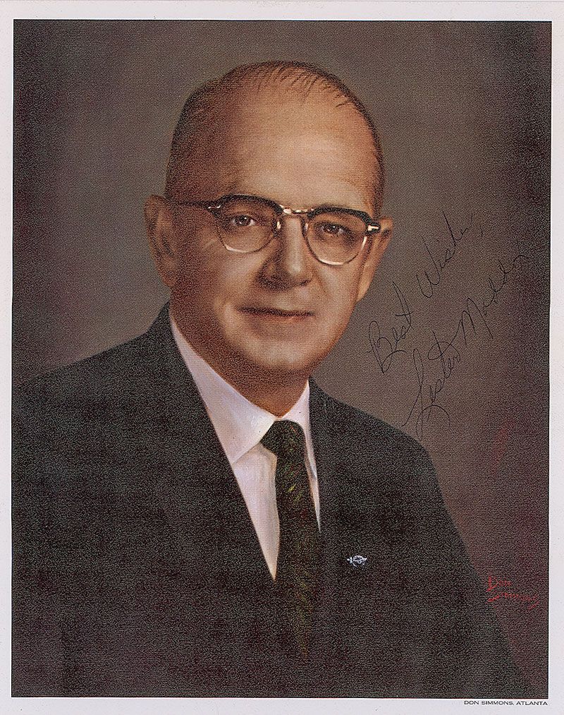 Governor of Georgia who came to prominence as a staunch segregationist (1915–2003). Color matte-finish 8 x 10 photo of a portrait of Maddox by Don Simmons, signed in black ink, “Best Wishes, Lester Maddox.” In fine condition.