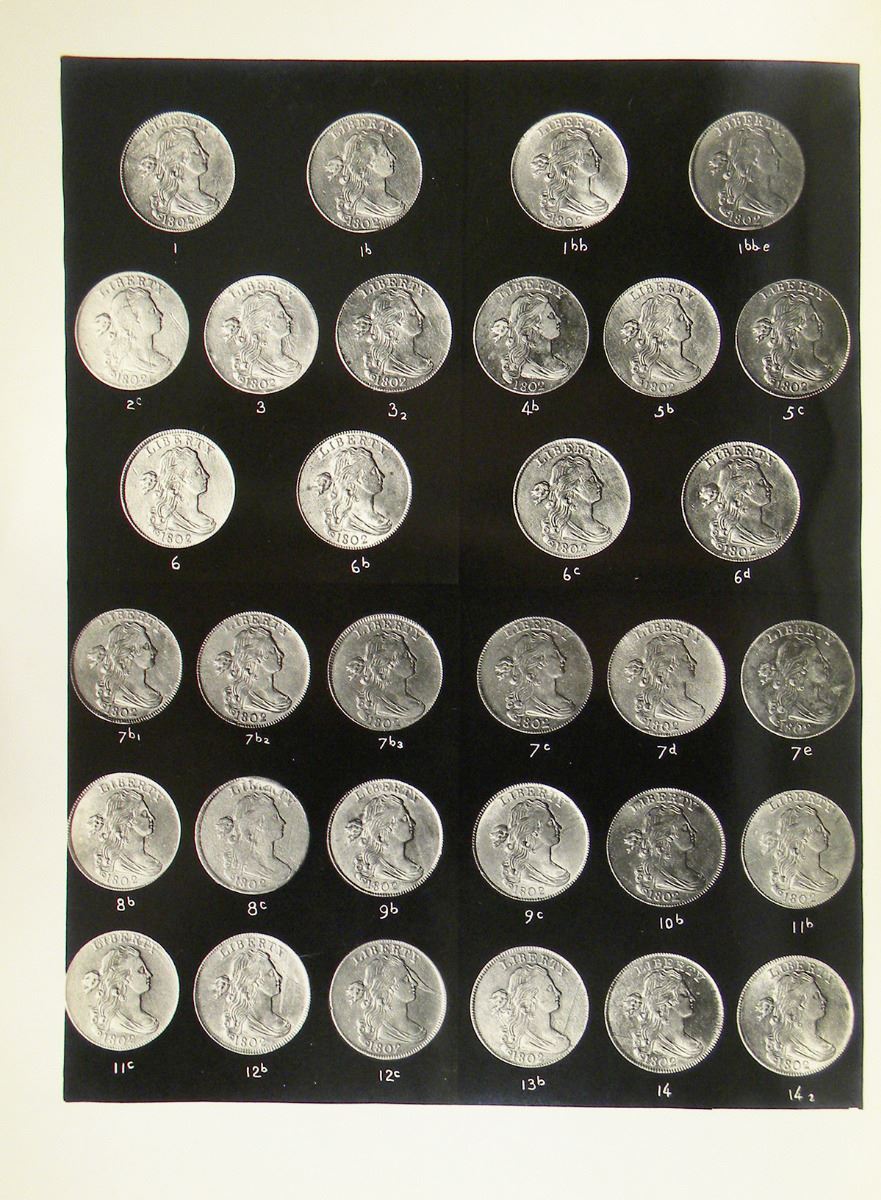 Newcomb, Howard R. THE UNITED STATES CENTS OF THE YEARS 1801-1802-1803. Detroit, 1925. 4to, original brown cloth, gilt. 85, (1) pages; 5 fine photographic plates; addition slip tipped in on page 73; green silk marker with the cardboard cent gauge present. Loosely laid in are the July 1931 photographic supplemental plate describing and depicting new 1801 varieties and the January 1928 photographic supplemental plate describing and depicting a new 1803 variety. Some authorial annotations in pencil. Ex Lester Merkin, with his bookplate. Near fine. Lester Merkin’s rather nice copy of one of the major pre-Sheldon works on U.S. large cents. Concerning Newcomb and this work, Dr. Sheldon wrote: “during the first quarter of the twentieth century and until his death in 1945, Howard R. Newcomb was so closely identified with the big cents that to mention cents was to mention Newcomb... The United States Cents of the Years 1801-1802-1803 ... marks a milestone in the cent literature. Approaching a field which had been left almost in chaos by the Doughty book, Newcomb assembled a vast quantity of numismatic material, ordered and reordered it, finally set up a new classificational system and a list which seemed adequate; and after testing the new list for upwards of a decade, published. The verdict of time on this work has been favorable.” This copy includes both supplemental plates, which are often not encountered. Davis 745. Voted as one of the Numismatic Bibliomania Society’s “One Hundred Greatest Items of United States Numismatic Literature.”