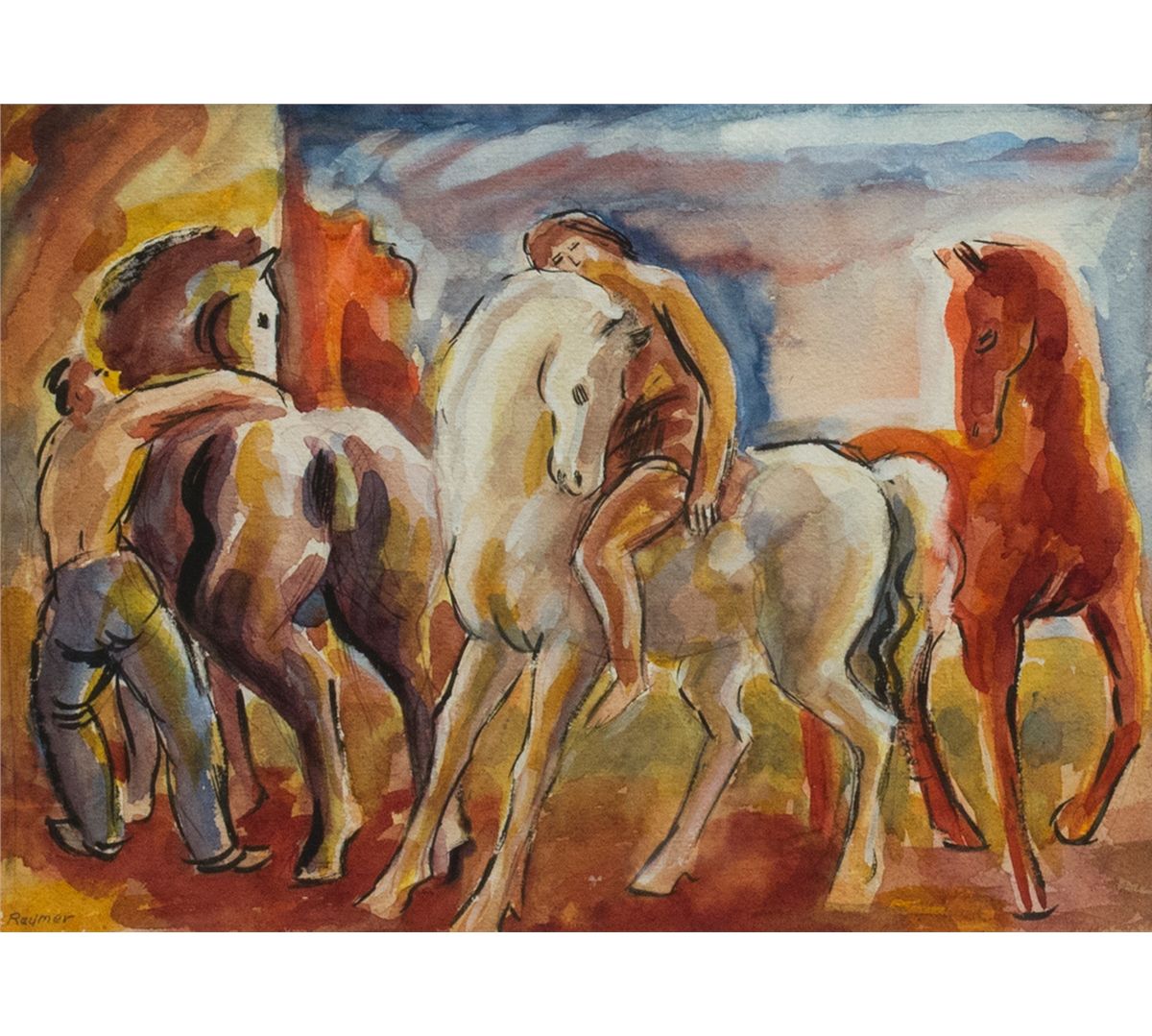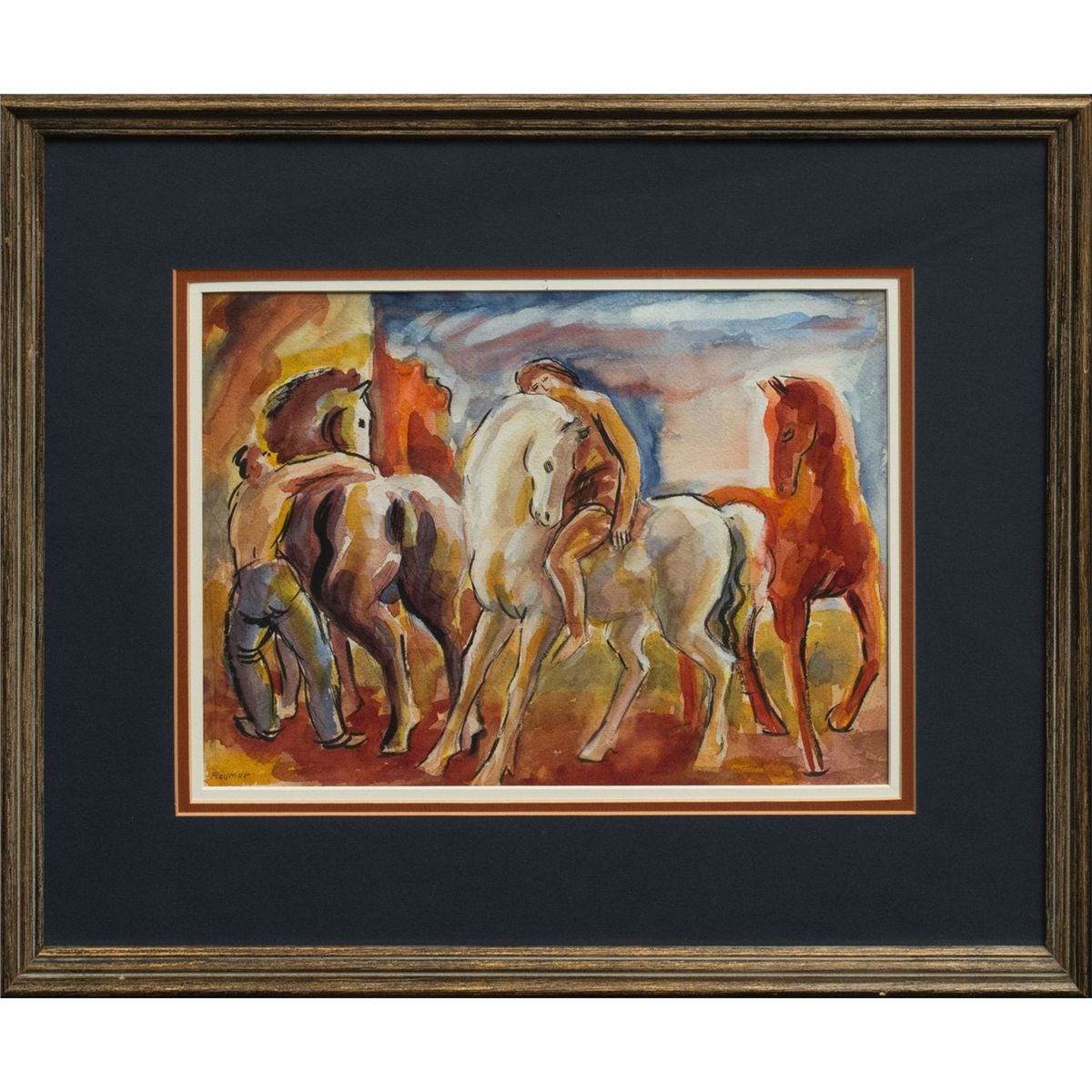 Lester Wilton Raymer (1907 - 1991). Three Horses. 9" x 12.5" watercolor. Signed lower left: Raymer Provenance: Bethany College, Lindsborg, KS.