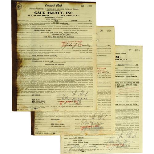<B>Lester Young Secretarial Signed Contracts.</B></I> Three Gale Agency performance contracts for shows at the Blue Note, one dated October 5, 1956 and two dated January 22, 1957, each signed in Young's name by a representative. In Fine to Very Fine condition with heavy discoloration along the left edge of the January 22 contracts.<BR><BR><b>Shipping:</b> Flat Material, Small (<a target="_blank" href="http://www.heritageauctions.com/common/shipping.php">view shipping information</a>)