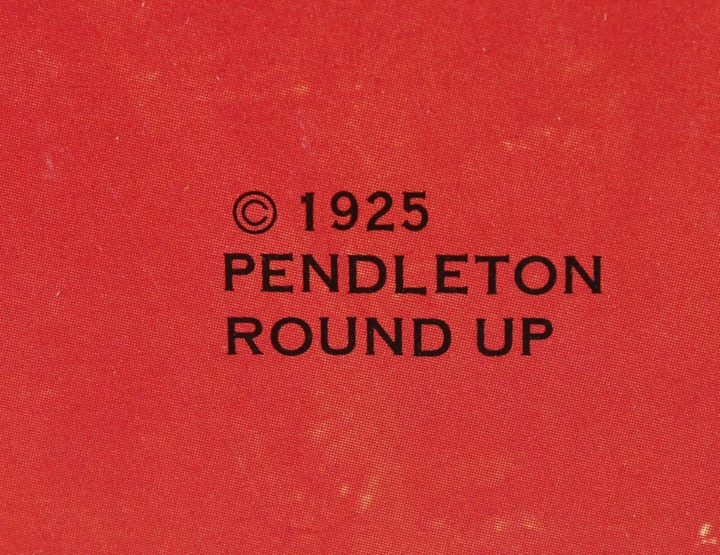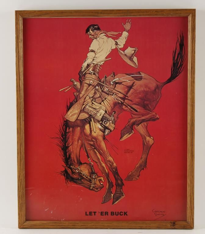 1925 Pendleton Roundup. Depicting cowboy on bucking bronco with red backdrop. Framed 17" wide x 21" high. By Wallace Smith.