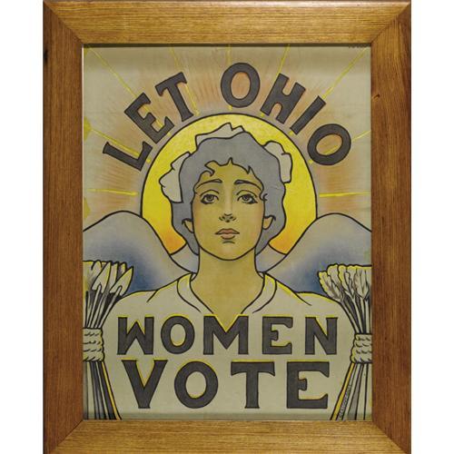 <B>Let Ohio Women Vote Suffrage Poster</B></I> In 1894 with the leadership of the National Women Suffrage Association starting to splinter, the then treasurer, Harriet Upton Taylor, moved the organization to the small town of Warren, Ohio. Ohio women had been involved in the movement from the start but with a local headquarters and the push for state to state ratification of the 19th amendment, Ohio women were now more involved then ever.<BR><BR>In muted pastels with a golden sun behind her, woman is pictured with shafts of wheat at her side. Known to collectors in its popular postcard version, this is the first time a poster variation with this graphic has ever been offered. Measuring 20.5" by 26.75", the poster retains it's original color. Minor repair has been made to a couple of edge trouble spots where they have been professionally tipped in and matched to the background. Two minor stains appear on the left edge and several creases have been flattened. In the bottom corner the artist's name appears as C Cassady Davis and in the top right corner the print number appears showing this to be the complete poster.<BR><BR>Seldom, does an item of this quality and presence find it's way to market. Whether this poster hung in a headquarters or was used when Ohio women marched for the suffrage plank in Columbus (1913), it is amazing that this poster has survived. We are proud to offer our collectors the opportunity of a lifetime.<BR><BR><b>Shipping:</b> Framed - with Glass, Medium (<a target="_blank" href="http://www.heritageauctions.com/common/shipping.php">view shipping information</a>)