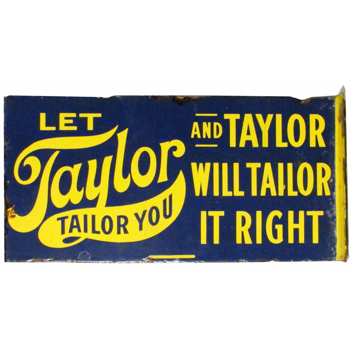 Let Taylor Tailor You Porcelain Flange Sign, two sided. Crazing and edge chips otherwise good condition. 18 X 9 inches.