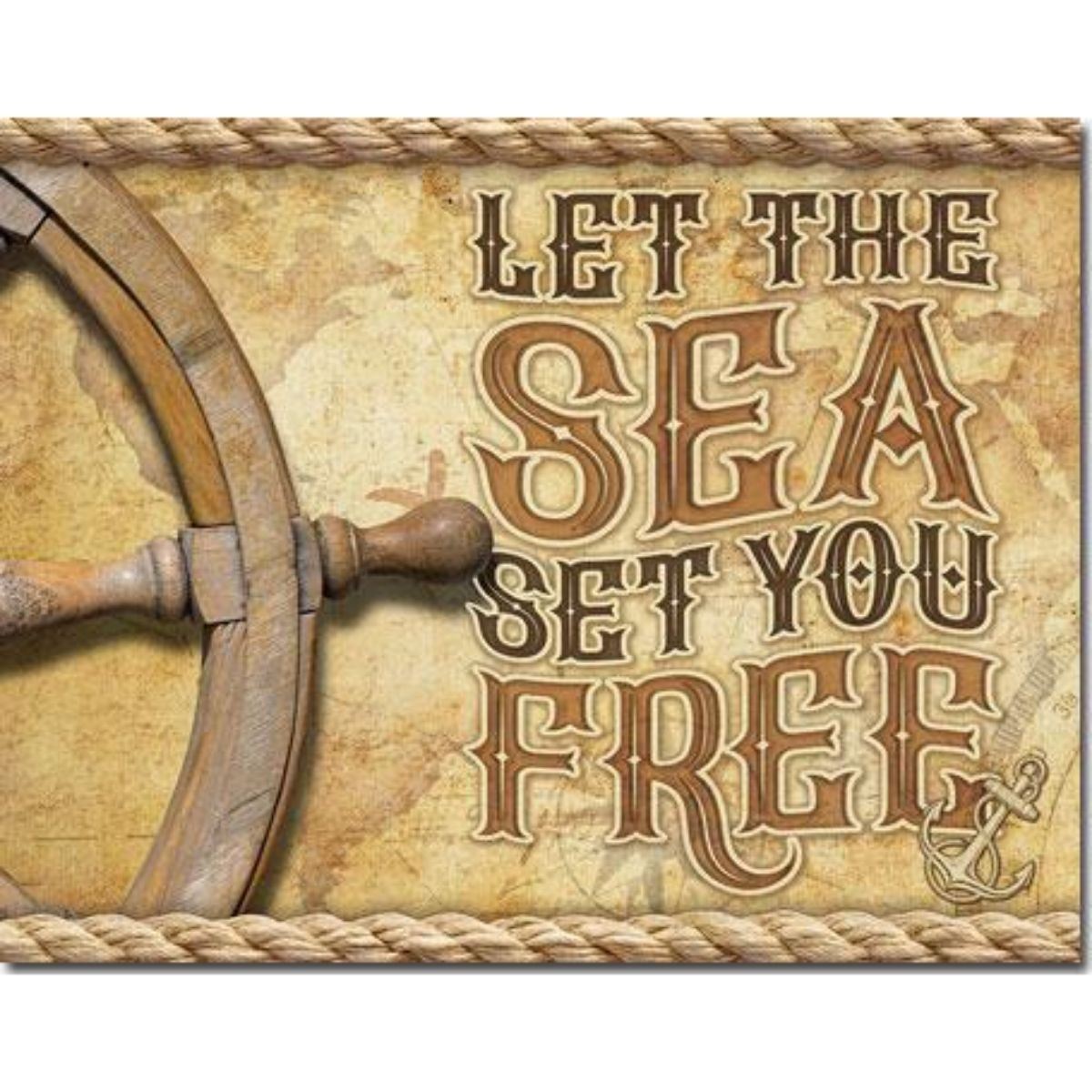 "Let The Sea Set You Free" metal pub bar, boating sign. 12 1/2" X 16" with pre-drilled holes for mounting.Â