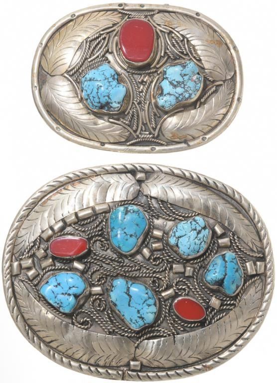 Set of 2 large silver Western Belt Buckles, both are set with Turquoise Nuggets and coral.