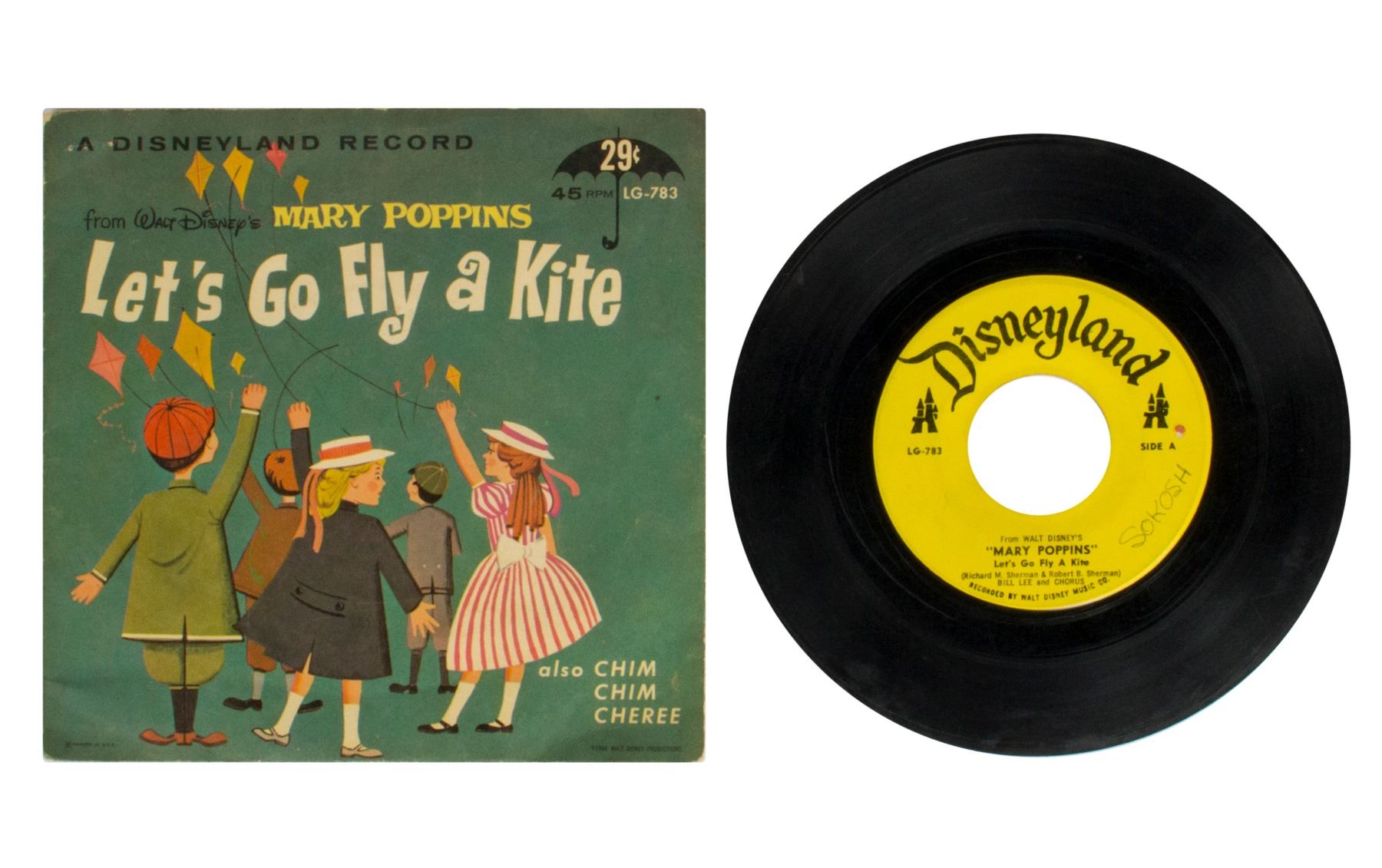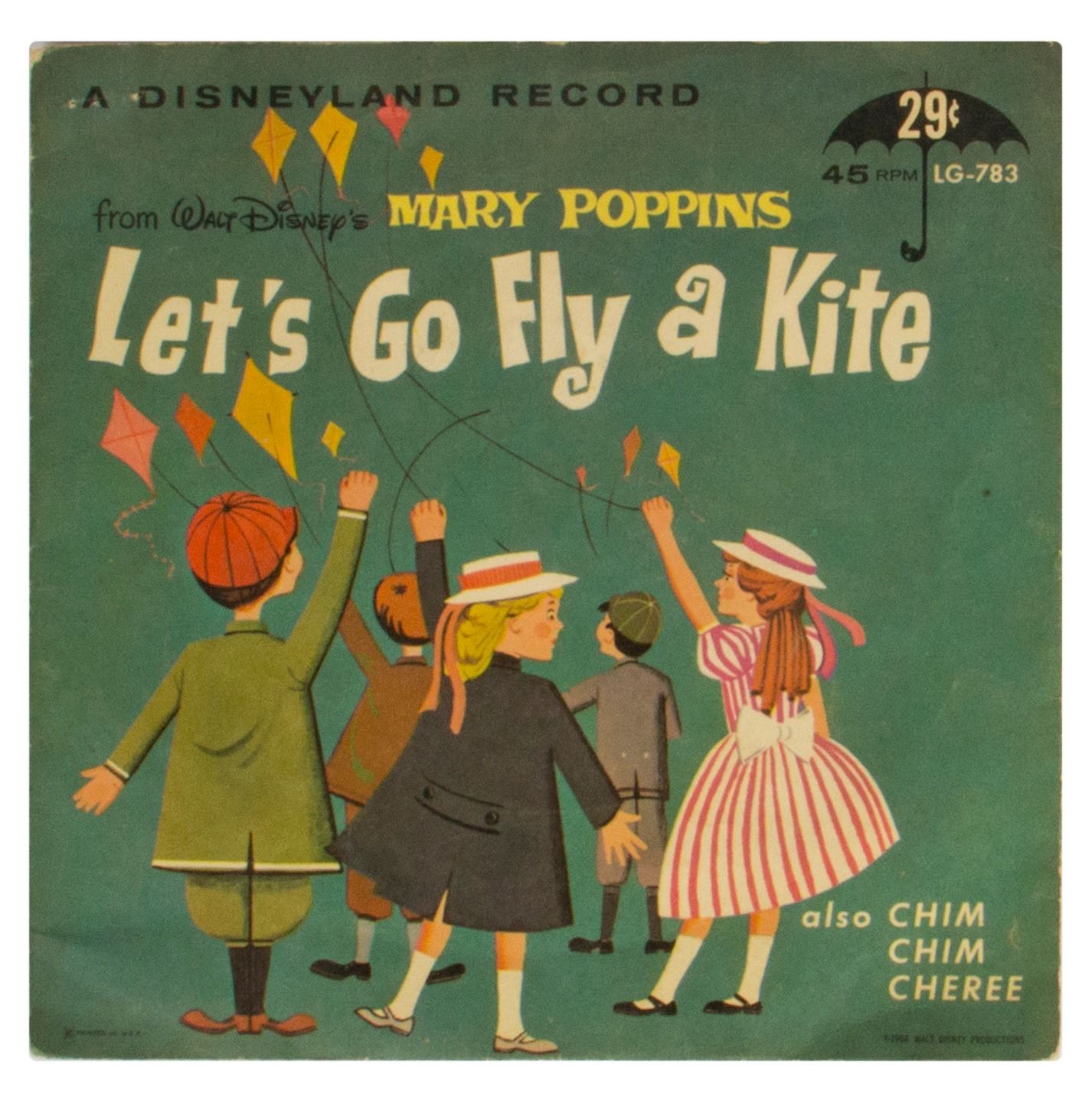 (Disney, 1964) A rare Disneyland 45rpm record titled "Let's Go Fly a Kite" from Walt Disney's "Mary Poppins". The album cover measures 7.25"x7.25" and the condition is good with some surface scratches from use and some separation along the right side of the album cover. The original owner wrote their name on the record label, and there are some red marks on the back side of the album cover.