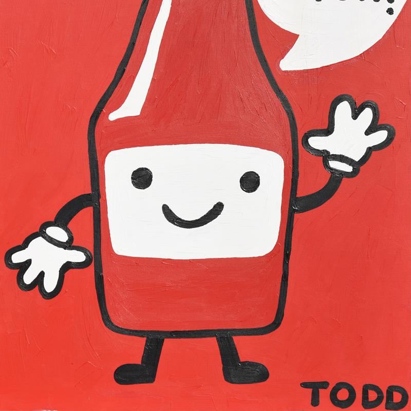 "Let's Ketchup" is an original acrylic painting on gallery wrapped canvas by Todd Goldman, hand signed by the artist. Includes Letter of Authenticity. Measures approx. 72" x 48" (image). Due to the way this piece was stored there may be minor wear or signs of age (such as wear on the corners) but the piece is in overall good condition.