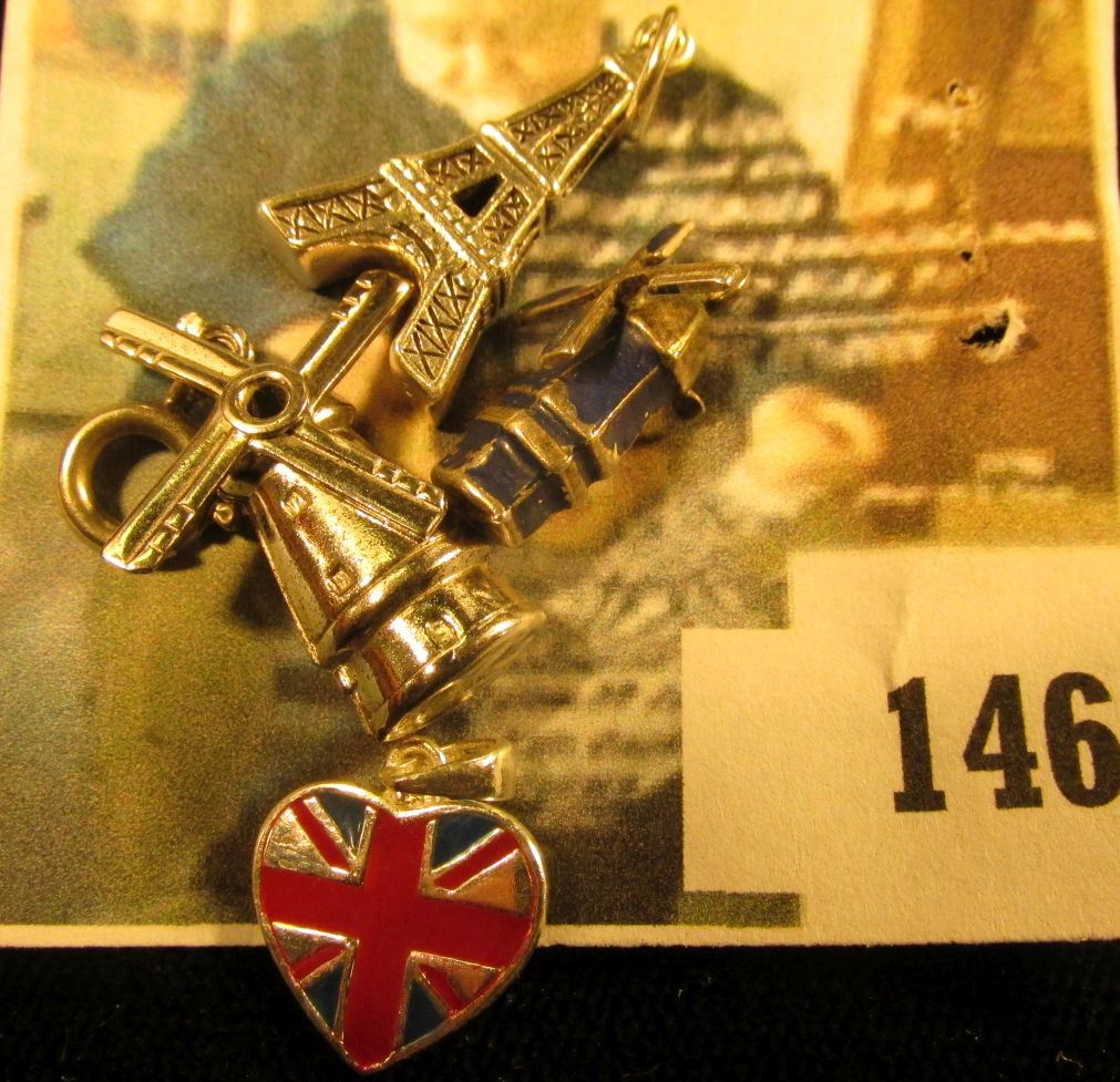 Let’s take a trip! 4 925 travel related charms, (2) windmills (blades rotate), British flag on a heart and Eiffel Tower, 6.6 g / 4.3 dwt. We’ll save you the airfare!