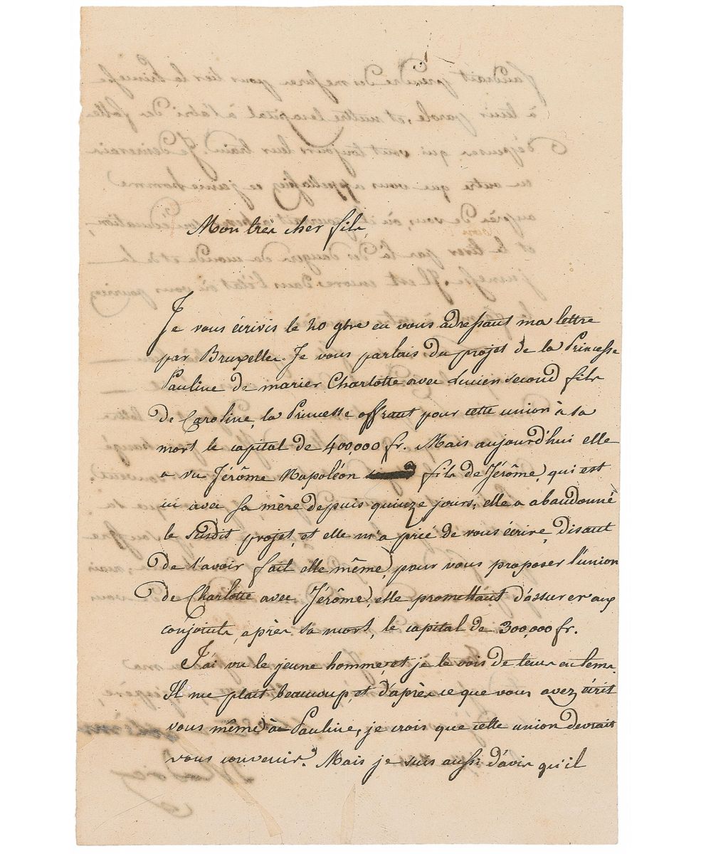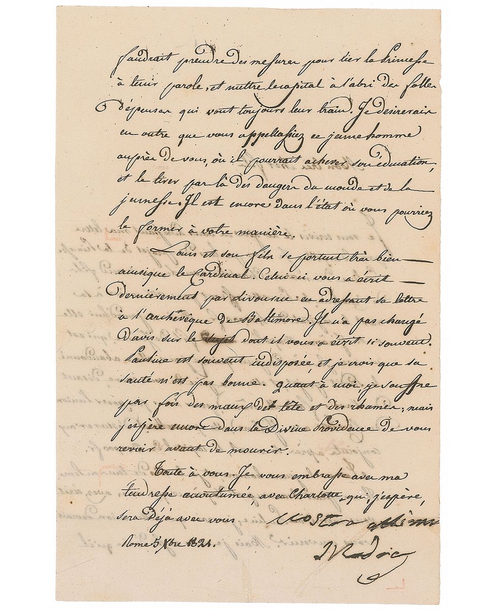 Mother (1750–1836) of Napoleon Bonaparte who shared her son’s exile in Elba during 1814. LS in French, signed “Vostra aftisma Madre,” one page both sides, 4.75 x 7.5, December 5, 1821. Letter to one of her sons relaying family news, primarily on marriage plans for her grandson. In part (translated): “I told you about the project of Princess Pauline to marry Charlotte with Lucien, second son of Caroline…But after she saw Jerome Napoleon, son of Jerome…she abandoned the aforesaid project, and requested me to write to you…for offer the union of Charlotte with Jerome…From what you wrote yourself to Pauline, I believe that this union should be OK. But I also think there should be steps taken to hold the Princess to her word…As for me, I suffer from both headaches and colds: but I still hope in Divine Providence to see you before I die.” In fine condition, with show-through from writing to opposing sides.