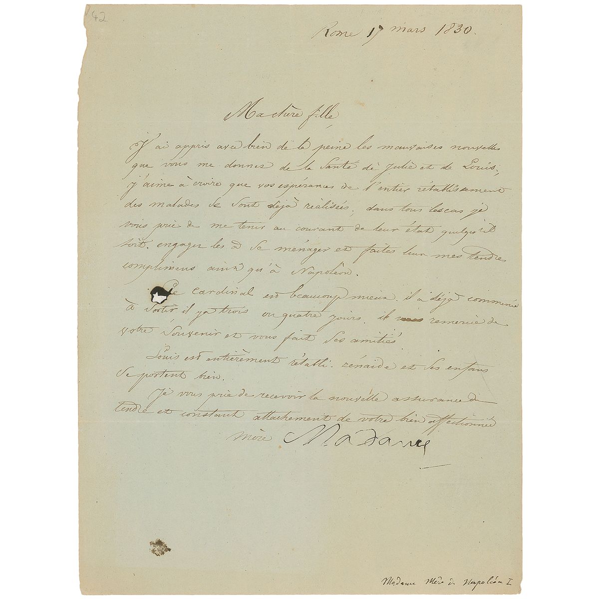 Mother of Napoleon Bonaparte (1750–1836) who shared her son’s exile in Elba during 1814. LS in French, signed “Madame,” one page, 7.25 x 9.75, March 17, 1830. Letter to “my dear girl,” presumably her granddaughter Charlotte, regarding family affairs. In part (translated): “I learned with great difficulty the bad news that you give me [regarding] the health of Julie and Louis. I like to think that your expectations of 'full recovery of patients' have already been made, and in any case I beg you to keep me informed of their condition…tender my compliments to the household and to Napoleon. Cardinal is much better, it has already started to come out…Zenaide and her children are doing well.” Intersecting folds, scattered creases, slight paper loss to upper left corner, and a small hole to the text from ink erosion (affecting two words), otherwise fine condition. The family members mentioned are, in order: Julie Clary, Charlotte's mother and wife of Joseph Bonaparte; Napoleon Louis Bonaparte, Charlotte's husband; Napoleon III, who became the first president of the French Second Republic; Cardinal Joseph Fesch, Letizia's half-brother; and Zenaide, Charlotte's sister. Although Julie recovered from whatever ailed her and lived into her 70s, Charlotte’s husband, Napoleon Louis, did not fare as well—he suffered from measles and passed away exactly one year later, on March 17, 1831, with the disease listed as the official cause.