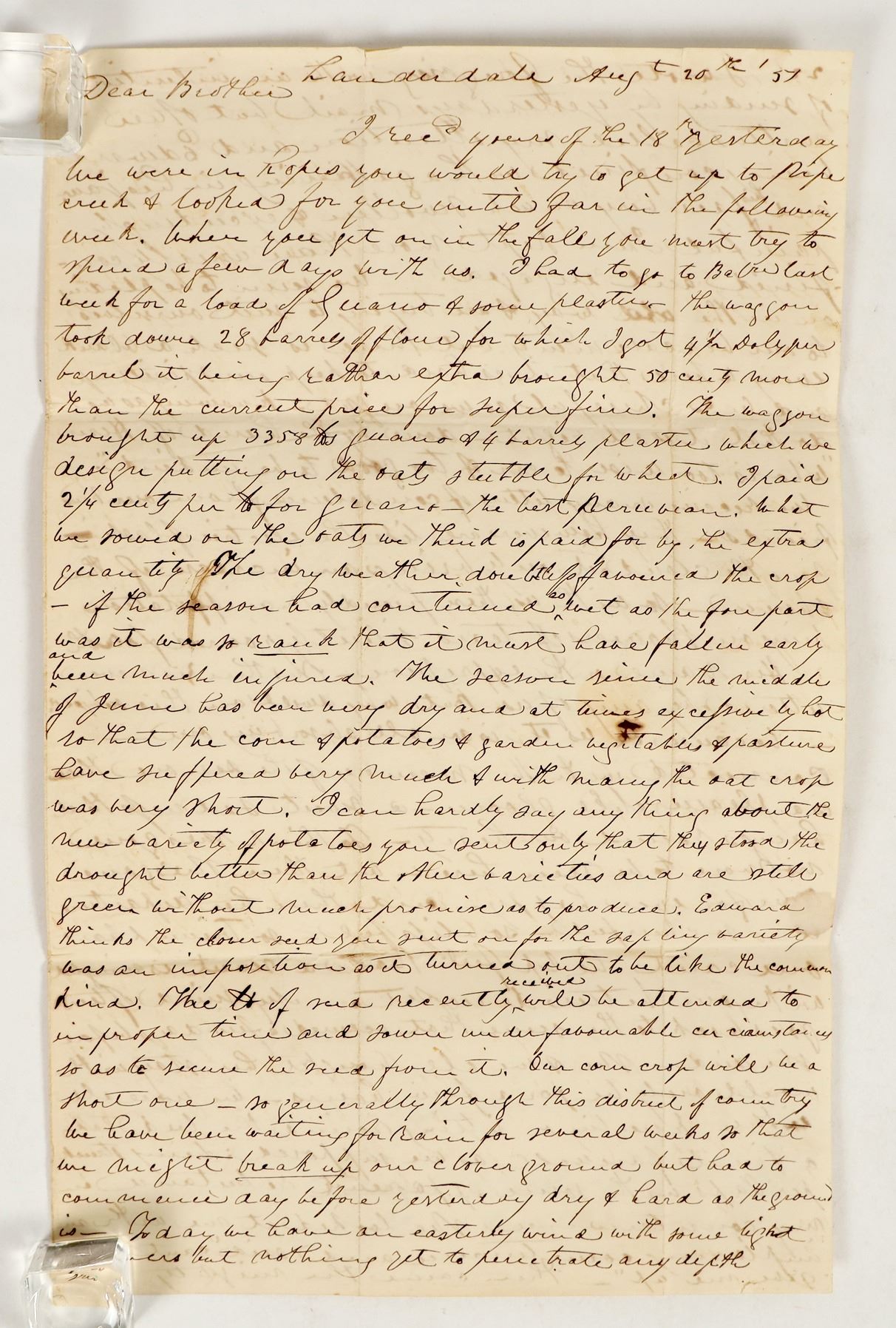 Letter Between Brothers 1857. Discussing the writers farm and prices obtained on different products. Als discussed persona' matters. In very good condition.