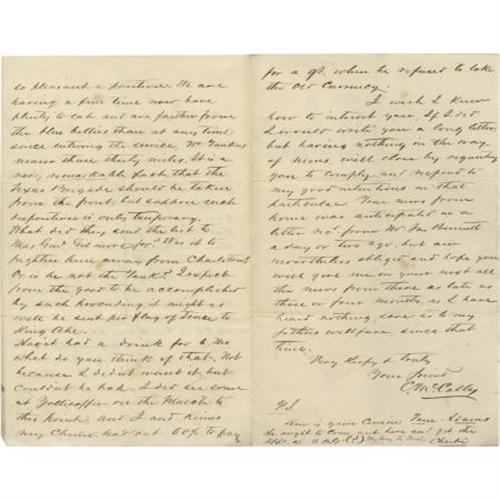 <B>Letter From a Private in the 5th Texas Infantry Field's Division.</B></I> From Charles M. McCally, three pages, 5 x 8, April 9, 1864, in ink, to recipient <I>Drape</B></I>. It would seem that this letter expresses McCally's displeasure at not having his application for promotion considered or approved. He writes in part <I>The Parlor Knights who dispense those forms cannot see how a man capable of filling the position sought can after three years service still be in ranks.</B></I> In another part of the letter he writes that he is receiving plenty to eat and that he is <I>farther from the blue bellies than at any time since entering the service</B></I>. He laments his sobriety writing <I>Hav'nt sic had a drink for 6 mo sic what do you think of that. Not because I didn't want it but couldn't be had.</B></I> A boldly written legible letter with interesting content, with the usual fold creases in very good condition. <BR><BR><b>Shipping:</b> Flat Material, Small (<a target="_blank" href="http://www.heritageauctions.com/common/shipping.php">view shipping information</a>)