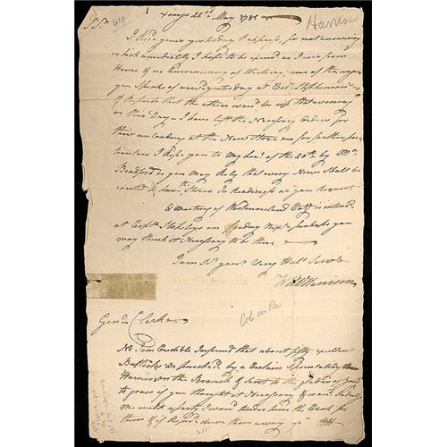 <Our item number 140266><B>[Clark, George Rogers] Letter Re A Planned 1780 Expedition Against Detroit.</B> Letter to George Rogers Clark, written and signed twice ("Will Harrison" and "WH") by William Harrision, Colonel in the American Revolution, 1p, 12½ x 8 in., "xings" [Fort Pitt], 22 May 1781 informing Clark of supplies for Clark's intended expedition against Detroit. Harrison reports that "… one of the wagons you spoke of arrive[e]d yesterday at Capt. Stephenson's & Reports that the other were to be up that evening or this Day (have left the necessary Orders for their unloading at the New Store for further particulars…every Nerve shall be exerted to have the stores In Readiness as you Request." He adds in a postscript, "…about fifty excellent Bullocks are purchas[e]d y a Certain Speculating Harris on the Branch & Sent to the glades of Yough[iogheny River] to grase [sic] if you thought it Necessary… I wou[l]d tender him the Cash for them & if Refus[e]d drive them away…" At the time, Clark was feverishly preparing for a grand expedition against Detroit as a follow up to his devastating campaign against the Indians on the Ohio the previous summer. The expedition never came to pass, however, because Washington worried that an expedition to Detroit would leave Pittsburgh defenseless. Pin holes at fold intersections, minor marginal loss not affecting text, tape mark at center left, else very good condition. <BR>Estimated Value $600 - 800. <BR><BR>Our item number 140266<BR><IMAGES><P ALIGN="CENTER"><IMG SRC="http://www.goldbergcoins.net/liveauction/49jpegs/140266.jpg"> </P></IMAGES>
