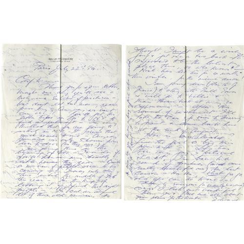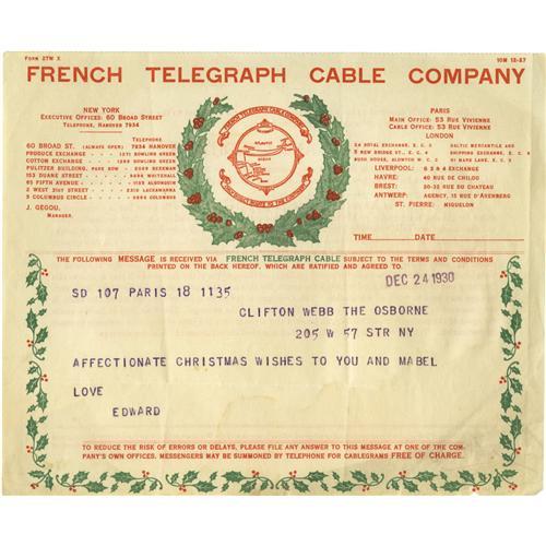 <B>Letter and Telegram to Clifton Webb from Edward, Duke of Windsor.</B></I> In writing to his friend Webb, Edward expressed his wishes to lease his home in Jamaica so that he might recoup the money he'd spent on its upkeep, as his neighbor Nol Coward had done -- "Nol has let his for 4 months this winter, for the mme reason!". Also mentioned in the correspondence is Edward's reception in society that season, on which he commented: "I've been to a round of parties... everyone (or <I>nearly</B></I> everyone) says I look just wonderful!". The letter is written on Edward's letterhead from his Quai D'Orsay office in Paris, along with the original mailing envelope with the Duke of Windsor's watermark ("DW") on its flap. A telegram from Edward to Webb is also included in this lot. Dated December 24, 1930, the telegraph relays Edward's "affectionate Christmas wishes" to Webb and his mother Mabel. Both items are in Very Good to Excellent condition with slight yellowing due to age and original mailing creases.<BR><BR><b>Shipping:</b> Flat Material, Small (<a target="_blank" href="http://www.heritageauctions.com/common/shipping.php">view shipping information</a>)