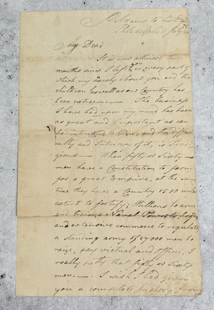 It is now almost three months since I left you in every part of which my anxiety about you and the children as well as our country has been extreme. The Business I have had upon my mind has been as great and important as can be entrusted to man (founders archive notes it mentioned the word "One" here however that is incorrect and aligns with footnote 2 on the website), and the difficulty and intricacy of it, is prodigious. When Fifty or Sixty men have a constitution to form for a great empire, at the same time they have a country 1500 miles extent to fortify; Millions to arm and train; a Naval power to begin; and extensive commerce to regulate, (the website states a line "numerous Tribes of Indians to negotiate with" which is missing from this transcription), a standing army of 27000 men to raise, pay victual and officers, I really pity that Fifty or Sixty men. (the site lists another paragraph that is missing from this transcription, "I must see you e’er long.——Rice, has wrote me a very good Letter, and so has Thaxter, for which I thank them both.——Love to the Children.")