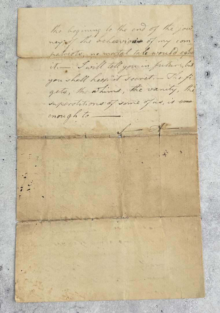 I wish I had given you a complete history from the beginning to the end of the journey, of the behavior of my compatriots, no mortal tale would equal it. I will tell you in future, but you shall keep it secret. I will tell you in future, but you shall keep it secret. The Fidgets, the Whims, the Vanity, the Superstitions of some of us, is enough to -----