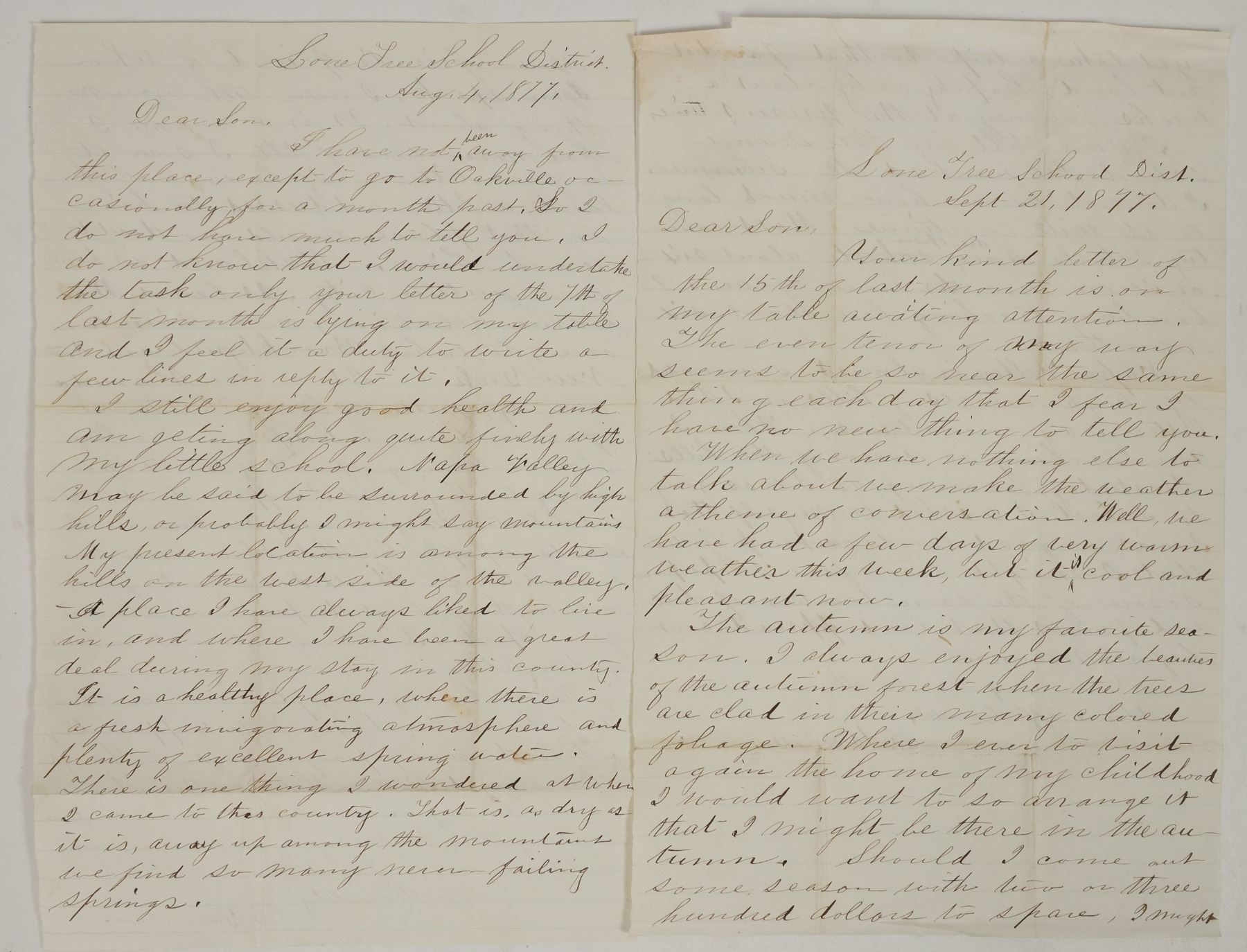 Lot of 2. Letters from a teacher at the Lon Tree School 1887, now part of Beale AFB. The person talks of trips to Napa, Oakland and life of a small country school teacher. Excellent cond. There is a printout of the history of Lone Tree,