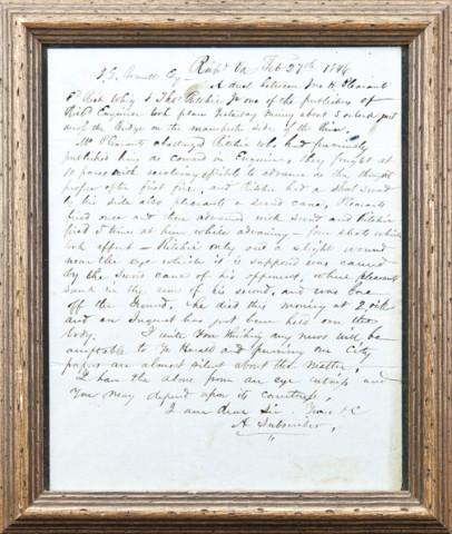Letter to J. G. Bennett, Esq, Richmond VA, 1846, concerning a duel between H. Pleasant, and Mr. Richey and states ‘Thomas Richey Jr of the Richmond Enquirer took place yesterday morning about 5 O’clock, The bridge on the Manchester side of the river. Mr. Pleasant challenged Richey who recently published him as a coward in the enquirer, they fought at ten paces with pistols, to advance as they thought proper after the first fire and Richey had a short sword by his side, also Pleasant a sword cane. Pleasant fired once and there was an advance with sword and Richey fired five times at him while advancing. Four shots which took effect. Richey only rec’d a slight wound near the eye which it is supposed was caused by the sword cane of his opponent, where Pleasant sank in the arms of the second and was bore off the ground. He died this morning at two o’clock and an inquest has been held over the body. I write you thinking any news will be acceptable to Harold and city papers are almost silent on this matter. I have the above from an eye witness. You may depend upon its correctness. Signed, a subscriber. Summarized. The document is on watermark stationary, good condition, fully