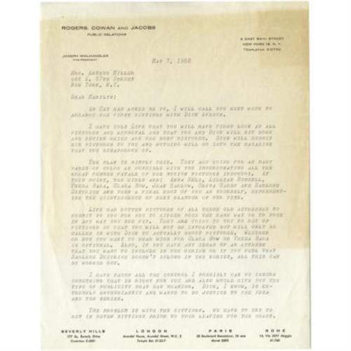<B>Letter to Marilyn Monroe Regarding Famous "Life Magazine" Layout.</B></I> This letter on Rogers, Cowan and Jacobs Public Relations stationery dated May 7, 1958, is addressed to "Mrs. Arthur Miller" at 444 E. 57th Street New York City and regards the famous <I>LIfe</B></I> Magazine layout in which Marilyn impersonated (as the letter notes) "all the great femmes fatale of the Motion Pictures Industry." The actresses listed in the letter are Ann Held, Lillian Russell, Theda Bara, Clara Bow, Jean Harlow, Greta Garbo, and Marlene Dietrich -- and called for is "a final shot of you as yourself; representing the quintessence of sexy glamour of our time." The letter mentions famed photographer Richard Avedon, the costume fittings, the possibility of wearing wigs for the Bow and Bara shots, and notes, "...if you have any idea of an actress that you want to include in the series or if you feel that Marlene Dietrich doesn't belong in the series, all this can be worked out." The letter has no closing signature. In Excellent condition. <I>Accompanied by a COA from John Reznikoff, PSA/DNA.</B></I><BR><BR><b>Shipping:</b> Requires 3rd Party Shipping (<a target="_blank" href="http://www.heritageauctions.com/common/shipping.php">view shipping information</a>)
