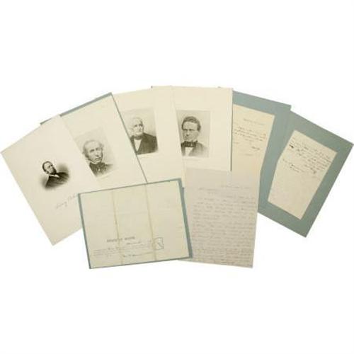 <B>Archive of Letters From Early Governors of Maine</B></I>. A lot of letters signed by various governors of Maine accompanied by several portraits of the included governors clipped from books. Included are letters signed by Samuel Wells, Samuel Cony, William Crosby and a document signed by Sidney Perham, in very good condition.<I> Ex. Henry E. Luhrs Collection</B></I>.<BR><BR><BR><b>Shipping:</b> Flat Material, Small (<a target="_blank" href="http://www.heritageauctions.com/common/shipping.php">view shipping information</a>)