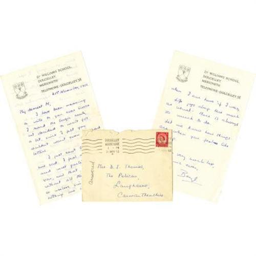 <B>Letters To Dylan Thomas's Mother And Widow,</B></I> as follows: <BR><B>Autograph Letter Signed,</B></I> “<I>Beryl</B></I>”, three pages, Merioneth, Wales, November 21, 1953, to Mrs. D. J. Thomas, Laugharne, Wales. A family friend here writes a letter of condolence shortly after the death of 39 year-old Dylan Thomas. She writes, in part, that “<I>…you will find great consolation in the fact that he was so very widely appreciated, both here and in America…</B></I>”. With original envelope, very fine condition. <BR><B>Typed Letter Signed,</B></I> “<I>Charlie</B></I>”, two pages, 8.5” x 11”, Rio Marina, Italy, June 6, 1955, to Caitlin Thomas, n.p. The author of this letter to Dylan Thomas's wife was C. P. Murchie, a friend living in Italy. A very informative and chatty personal letter that makes no mention of the deceased Mr. Thomas. Some soiling, fine condition. <BR><BR><b>Shipping:</b> Flat Material, Small (<a target="_blank" href="http://www.heritageauctions.com/common/shipping.php">view shipping information</a>)