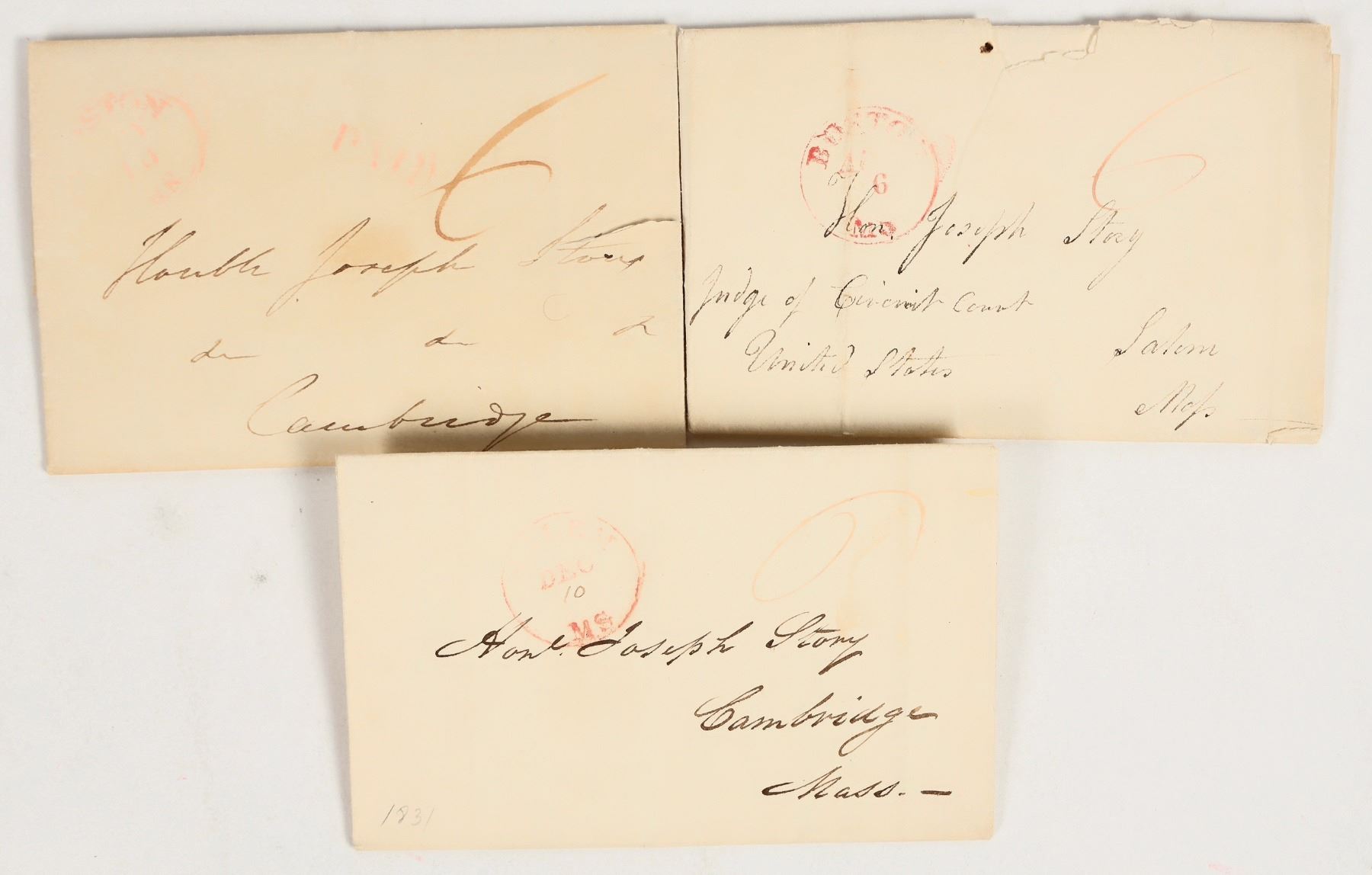 Lot of 3. Three letters to Hon. Joseph Story. One from his brother regarding the transfer of an insurance policy. Another of a person arriving in Washington on personal matter and the last one from a friend seeking either advice or referral in a legal matter. There is a biography of Joesph Story. He was the first-born of eleven children of Dr. Elisha Story who was a member of the Sons of Liberty and took part in the Boston Tea Party. Joseph was an attorney, Representative, was chosen Speaker 1811 and in the same year was the youngest Associate Justice of the Supreme Court of the United States.