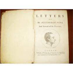 Letters of Alexander Pope and Friends (1737) Printed by J. Wright for J. Knapton in Ludgate Street, L. Gilliver in Fleet Street, J. Brindley in New Bond Street, and R. Dodsley in Pall Mall. Front cover is worn and detached from the binding. Pages are in good condition with some yellowing, tears, and stains, and still attached to the binding, although with some wear.