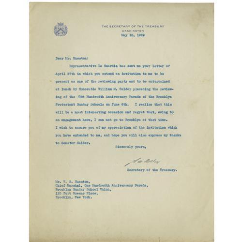 <B>Collection of Letters of Harding, Coolidge, Hoover, Hughes, Pershing, Hull, others.</B></I> Collection of 63 letters (60 TLsS, 3 ALsS), mostly 6" x 9" to 8.5" x 11", 1922-1934, most concerning attendance at the parade of the Brooklyn Sunday Schools. Most of the letters are to William S. Hueston, Chief Marshal, Brooklyn, New York. Includes: TLS: <B><I>"Warren G. Harding"</B></I> as President</B></I> (May 27, 1922) In part: <I>"Senator Calder's active interest, and your own letters, have served to keep in my mind the fact that the annual celebration of the Brooklyn Sunday School Union is to take place within a few days...I feel that this annual event cannot but be an inspiration to better citizenship, and certain to have in future, as in the past, a wide and highly desirable influence."</B></I> Very fine condition. With original addressed White House envelope with no postal markings indicating it was hand-delivered. TLS: <B><I>"Calvin Coolidge"</B></I></B></I> (May 5, 1931) <I>"It was kind of you to invite Mrs. Coolidge and me to repeat our visit to Brooklyn and we both regret that it is impossible for us to accept."</B></I> Soiled in blank areas at right corners, tanned at right and lower edges. Two TLsS: <B><I>"Herbert Hoover"</B></I> as Secretary of Commerce,</B></I> 1923 and 1928, each declining to attend. Tanned at right edges, else in fine condition. Also includes TLsS of Theodore Roosevelt, Jr. (3), Eleanor Roosevelt (as First Lady, 1933), John J. Pershing as General of the Armies (2), R. E. Byrd, Charles E. Hughes as Secretary of State (2), Herbert H. Lehman as Governor of New York (3), Cordell Hull as Secretary of State, A W. Mellon as Secretary of the Treasury, Nicholas Longworth as Speaker of the House (2), Charles Curtis as Vice President (2), Robert F. Wagner as U.S. Senator, Dwight D. Davis as Secretary of War, Harry S. New as Postmaster General, Arthur W. Hyde as Secretary of Agriculture, James W. Good as Secretary of War (served only nine months before dying in office), Charles F. Adams as Secretary of the Navy, Ray Lyman Wilbur as Secretary of the Interior, William D. Mitchell as Attorney General, Alfred E. Smith as Governor of New York, Henry L. Stimson as Secretary of State, Curtis D. Wilbur as Secretary of the Navy, James J. Davis as Secretary of Labor, and Hubert Work as Secretary of the Interior. Includes newspaper articles and related items. Minor defects, mostly light tanning. Overall, in fine condition. Collection placed in display sheets in a loose-leaf album.