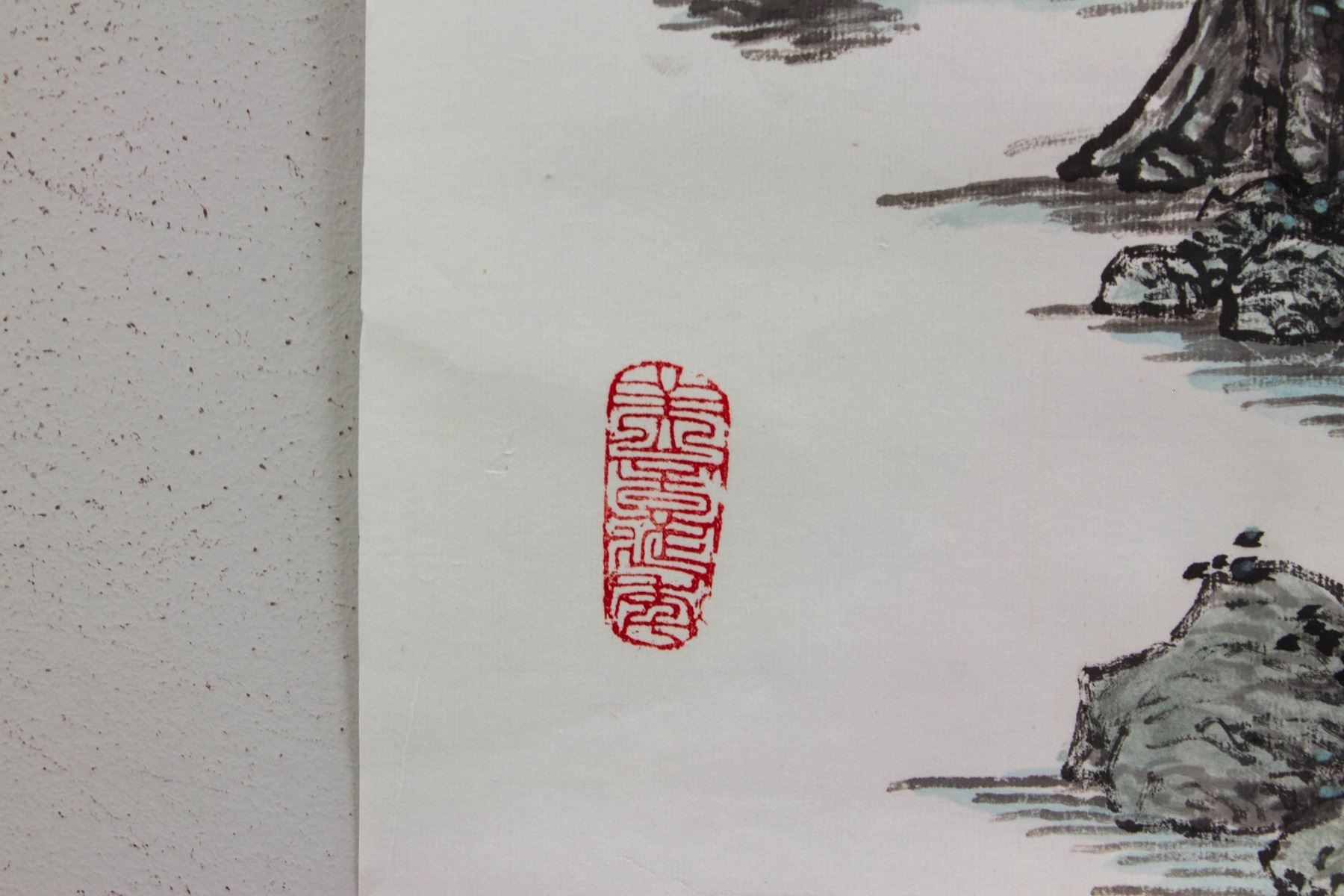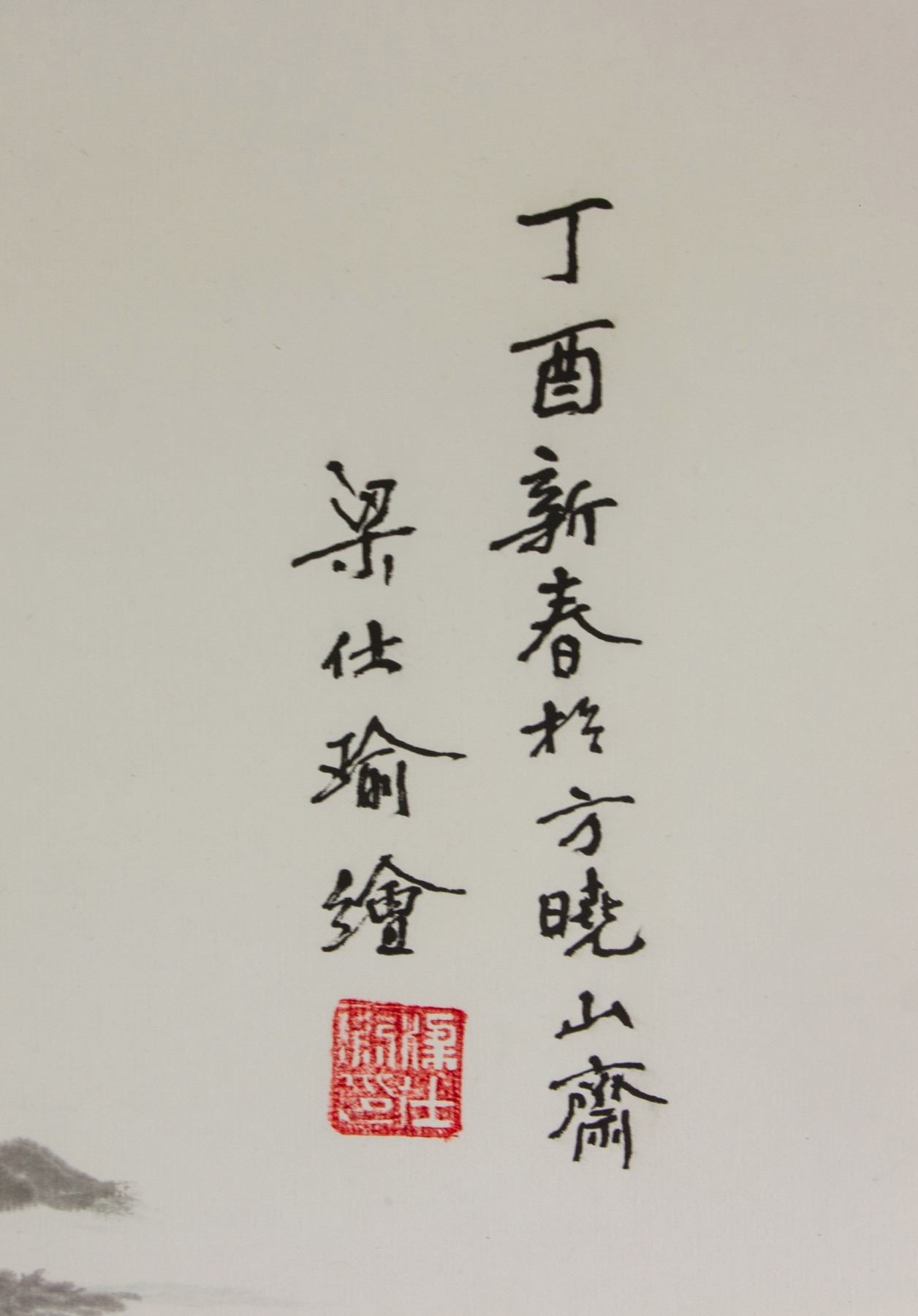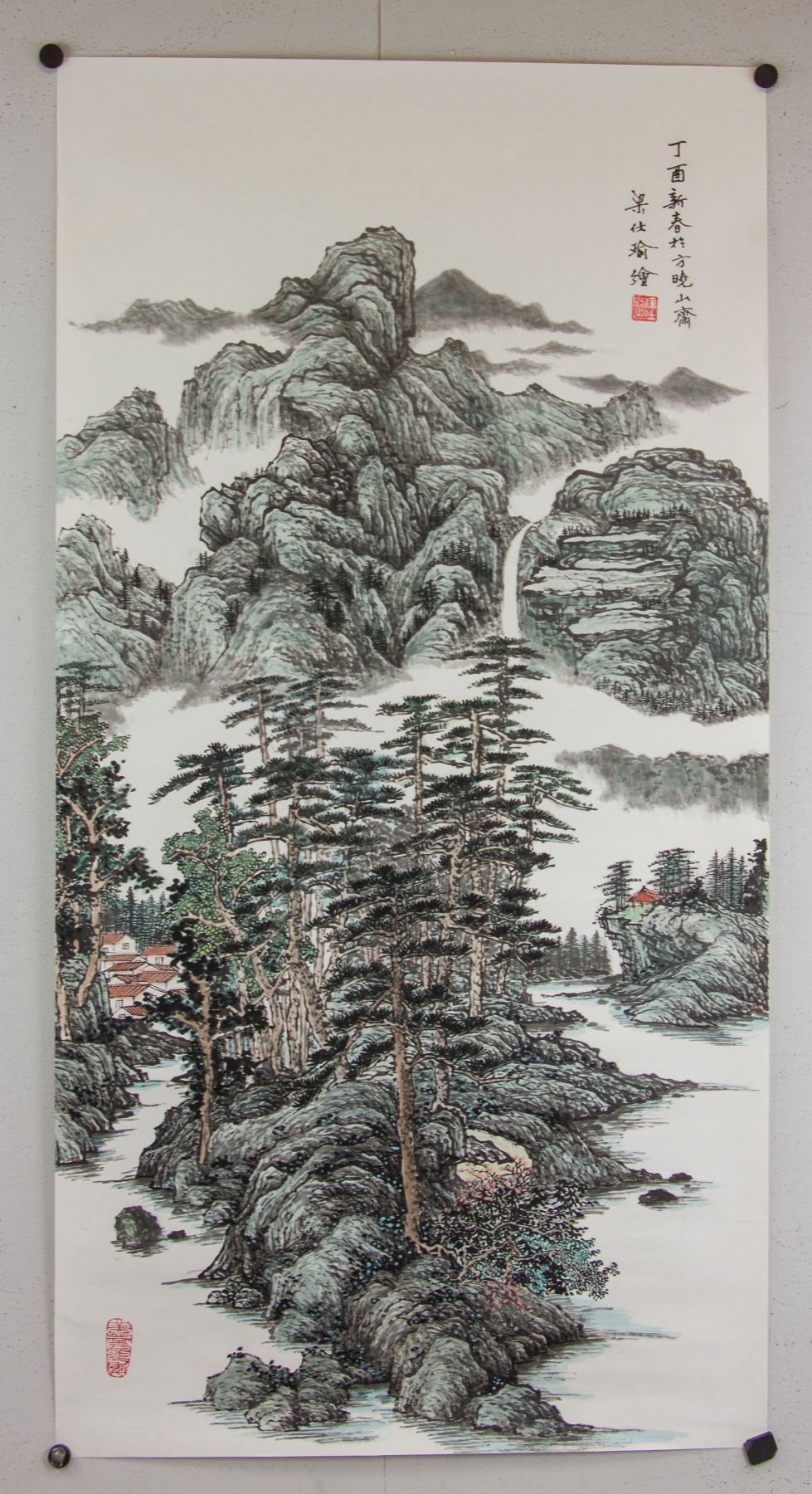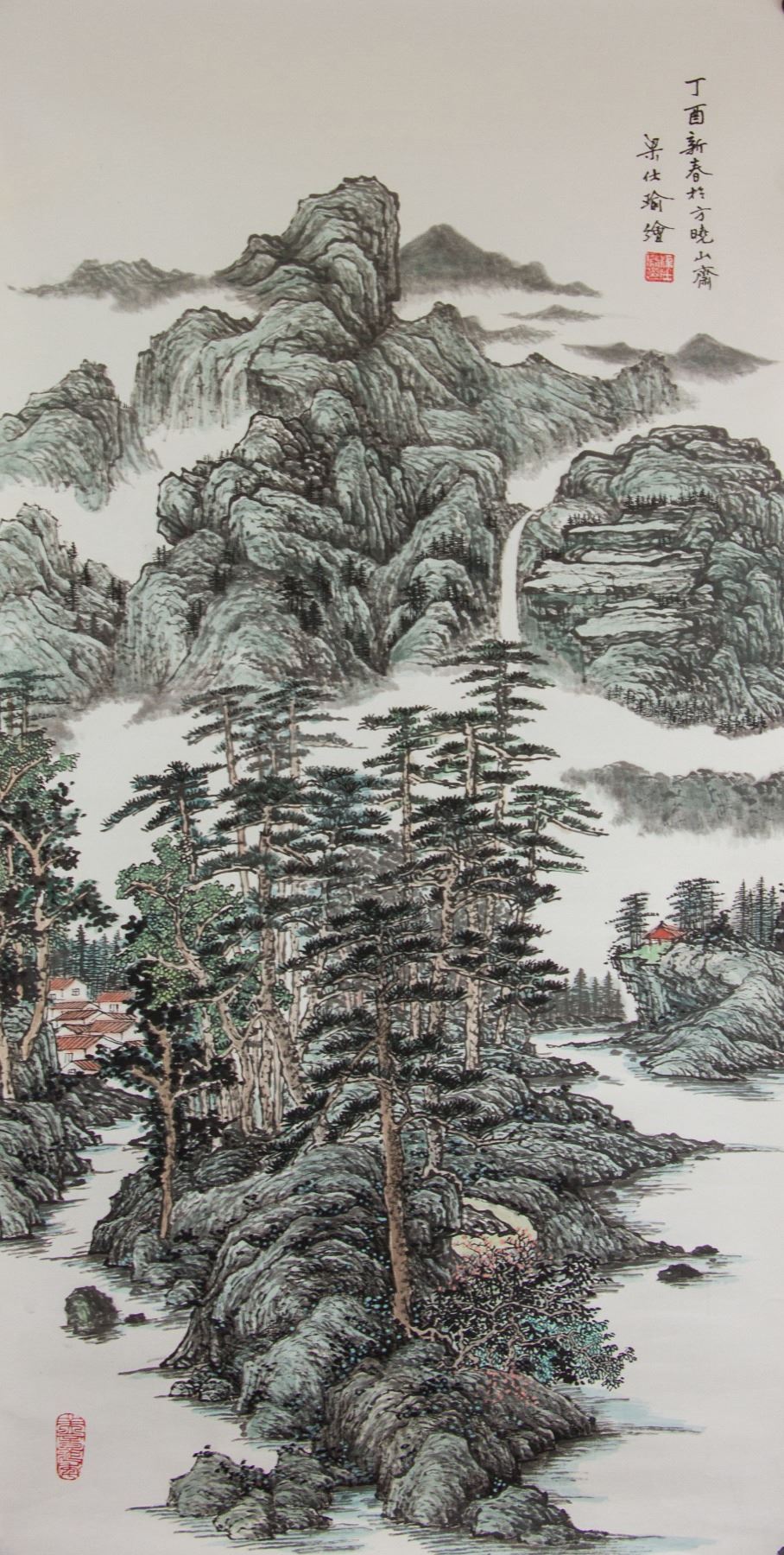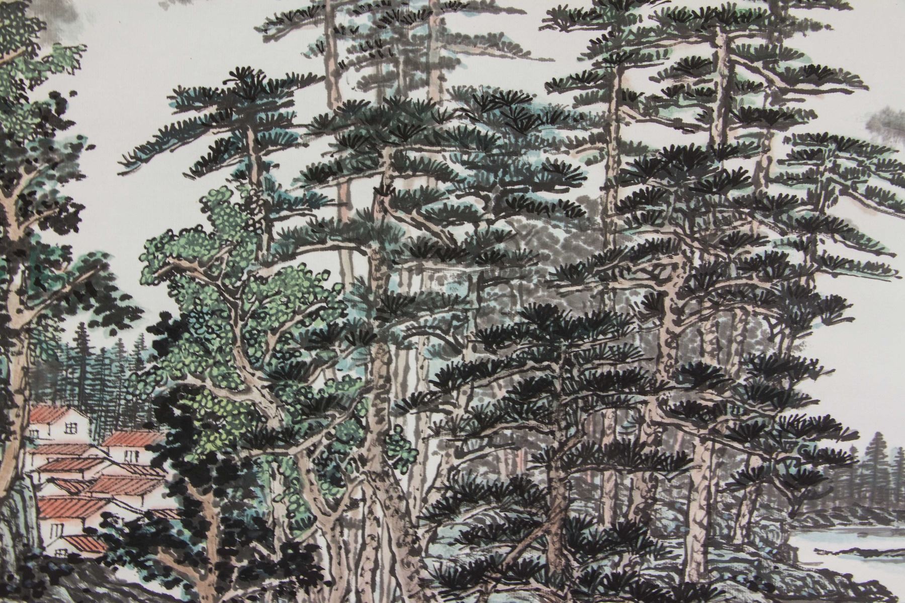 Mountainous landscape with village; Chinese ink and watercolour on paper; signed Liang Shiyu (b.1945); inscribed with 2 artist seals; 111 cm x 57 cm