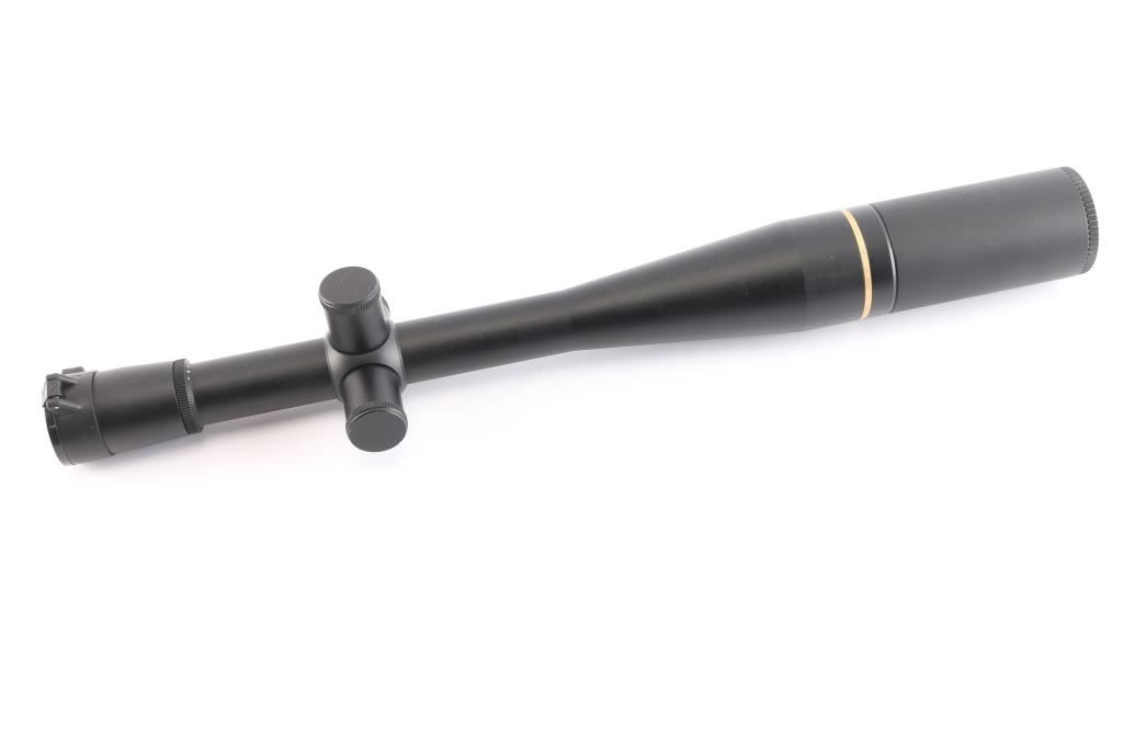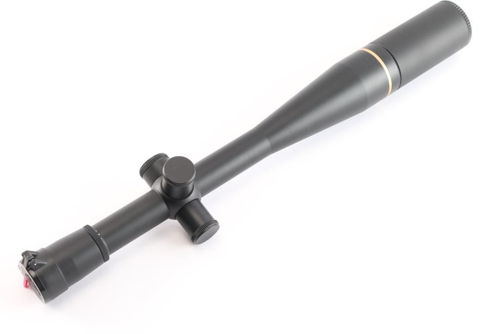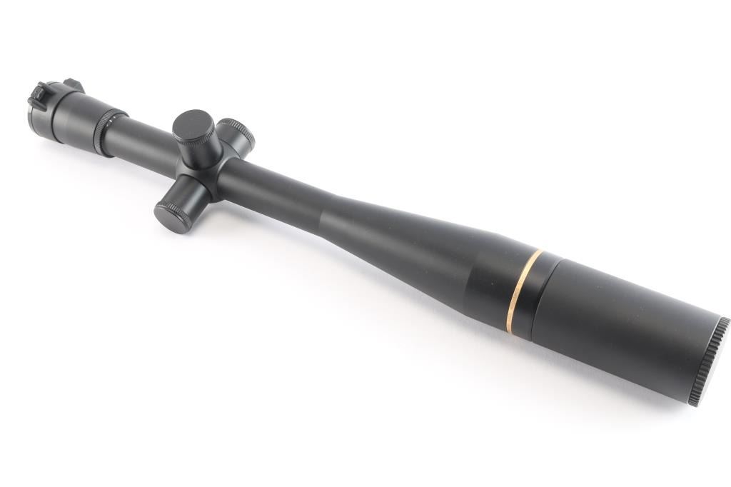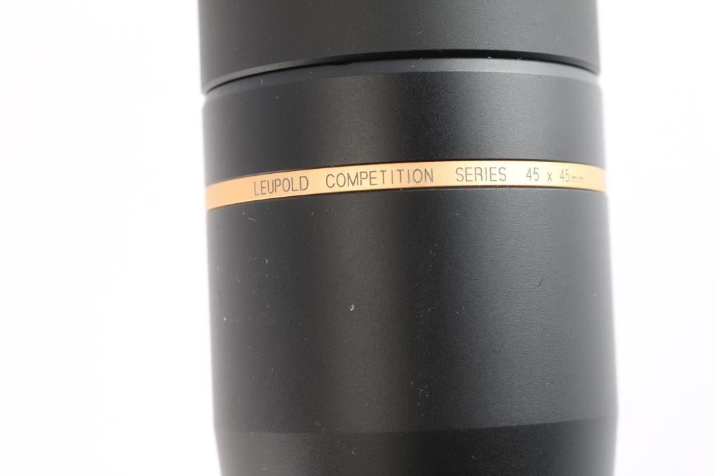 Leupold Competition 45x 45mm scope. Matte black. Glass is clear with target crosshair. Eyepiece flip back lens cover and 4 inch lens shade with threaded cover.