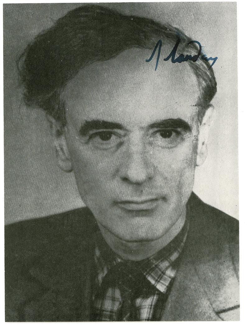 Russian physicist (1908–1968) who won the 1962 Nobel Prize in Physics for his research into ‘superfluidity.’ Lightweight 5 x 6.75 cardstock photo, signed in black felt tip. In fine condition.