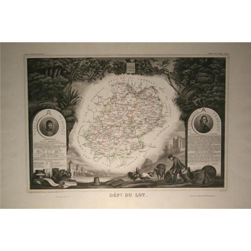 Levasseur?s maps are distinctive for their wide decorative margins containing elaborate depictions of the scenery, peoples, and trade goods of the areas he mapped. Levasseur maps are also known to offer a wealth of statistical data. Since present times, very few Levasseur maps were even moved out of France where they were mostly used in public libraries and town halls. This intricately detailed and beautifully rendered map, ?Dept. Du Lot?, by Levasseur depicts the department of Lot, located in the south central France. The department of Lot is located in the region of Midi-Pyrenees, which includes the cities: Calhora, Figeace, and Gourdon. There is beautiful outline coloring coupled with the exacting cartography that Levasseur is known for. His work represents some of the last great decorative atlases of the 19th century. This is an extraordinary map and is an exceptional value because of the map?s substantial amount of illustration and information in each legend pertaining to the individual location. This map would make a very valuable addition to anyone?s collection. His work represents some of the last great decorative atlases of the 19th century.