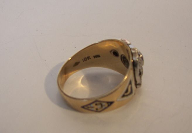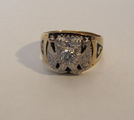 (7734) Level 32 Masonic Ring, 10 Karat Gold, With Solitaire Diamond Mounted On White Gold Eagles