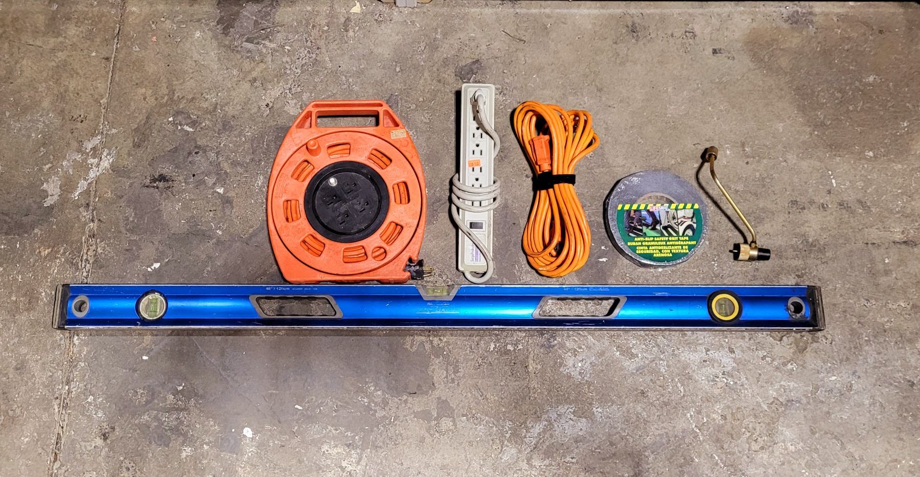 Level, Power Outlet Bar, Extension Cord & Tool Lot