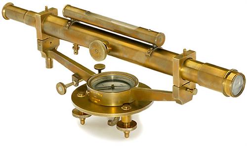 Level by "G. De Koningh", c. 1900 Marked Dutch brass surveying instrument, no. 815, compass with silvered scale Ø 3 1/7 in., large bubble level, length of telescope 20 in.<Br>