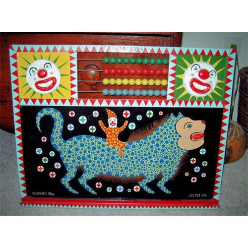 </font></strong>Levent Isik mixed media painting "Circus". This painting was done on a child's abacus chalkboard. He then added clown faces to the top corners and painted a clown riding a circus animal. Levent lives and paints in Columbus, Ohio and his art is increasing in value. The painting measures 19.5" by 35" and is very colorful. This would be a great addition to an outsider art collection.</font>