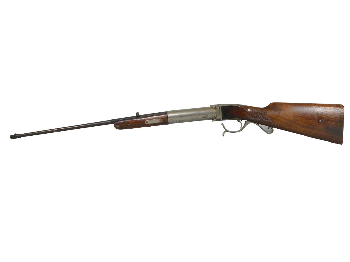 Lever Action BB Gun. Barrel breaks down for loading. Nickel plated brass, wood grip and stock. Grip is split in two at the bottom otherwise good condition. 41 inches total length.
