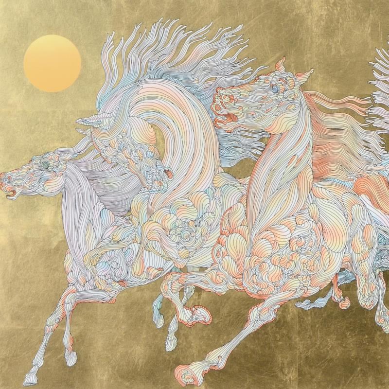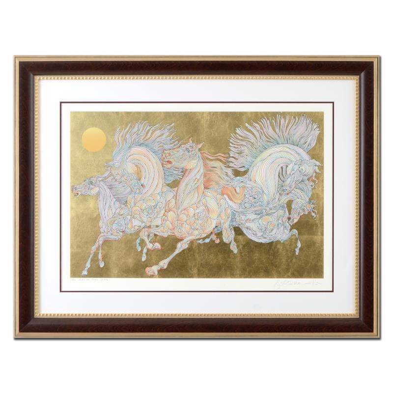 "Lever De Soleil" is a limited edition serigraph with hand laid gold leaf on artist paper by Guillaume Azoulay, numbered and hand signed by the artist. This piece comes custom framed. Includes Certificate of Authenticity. Measures approx. 46" x 36" (frame); 32" x 24" (image).