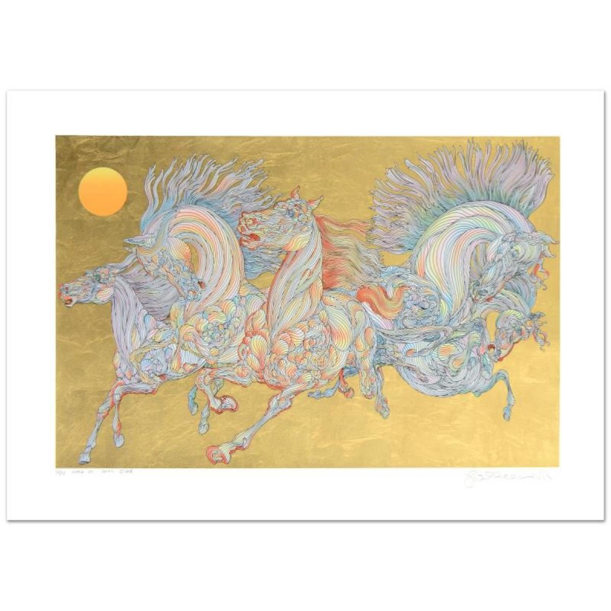 "Lever De Soleil" is a limited edition serigraph on paper with hand laid gold leaf by Guillaume Azoulay, numbered 50 out of 50 and hand signed by the artist. Includes Certificate of Authenticity! Measures approx. 38" x 27.5" (border)., 32" x 21" (image).