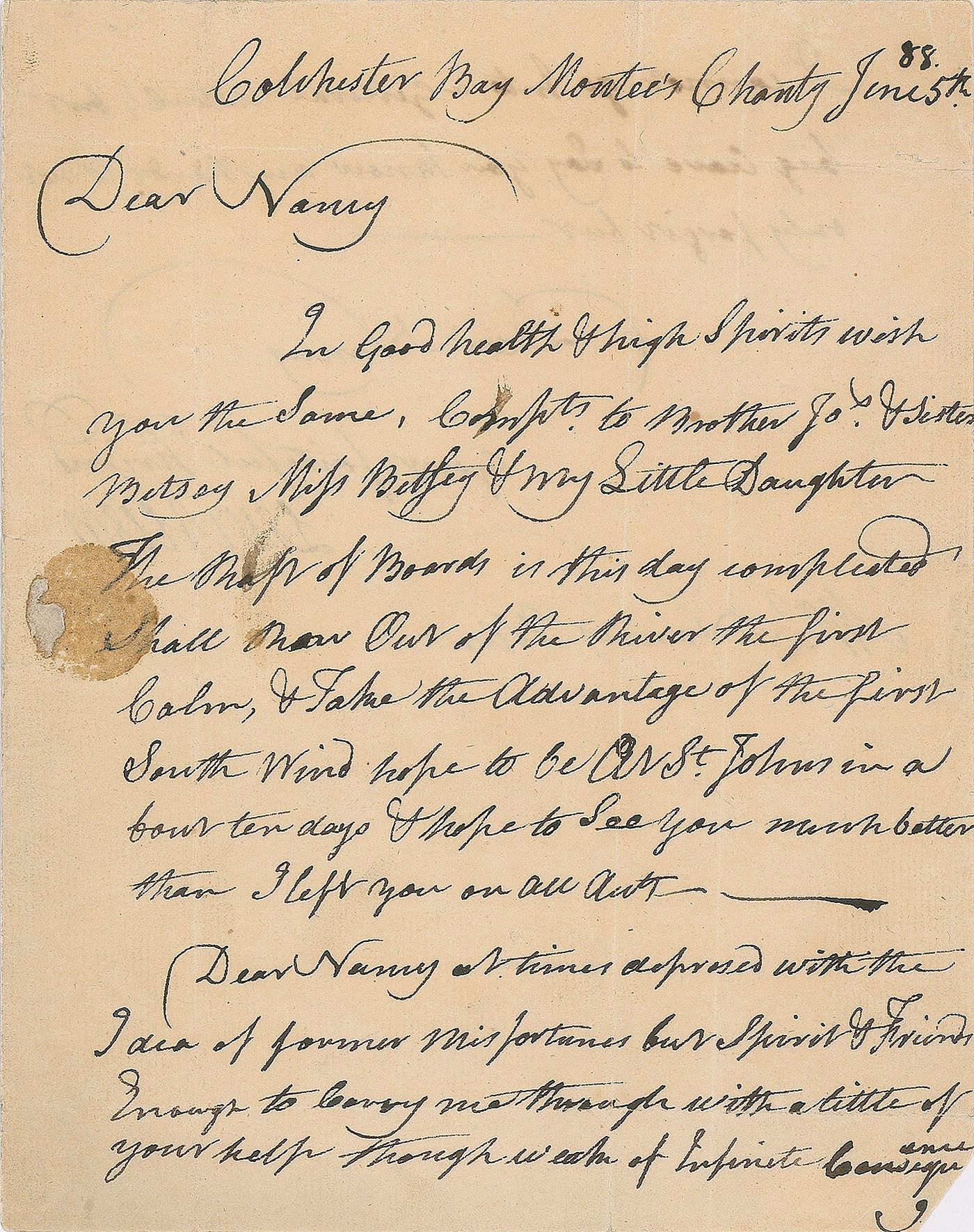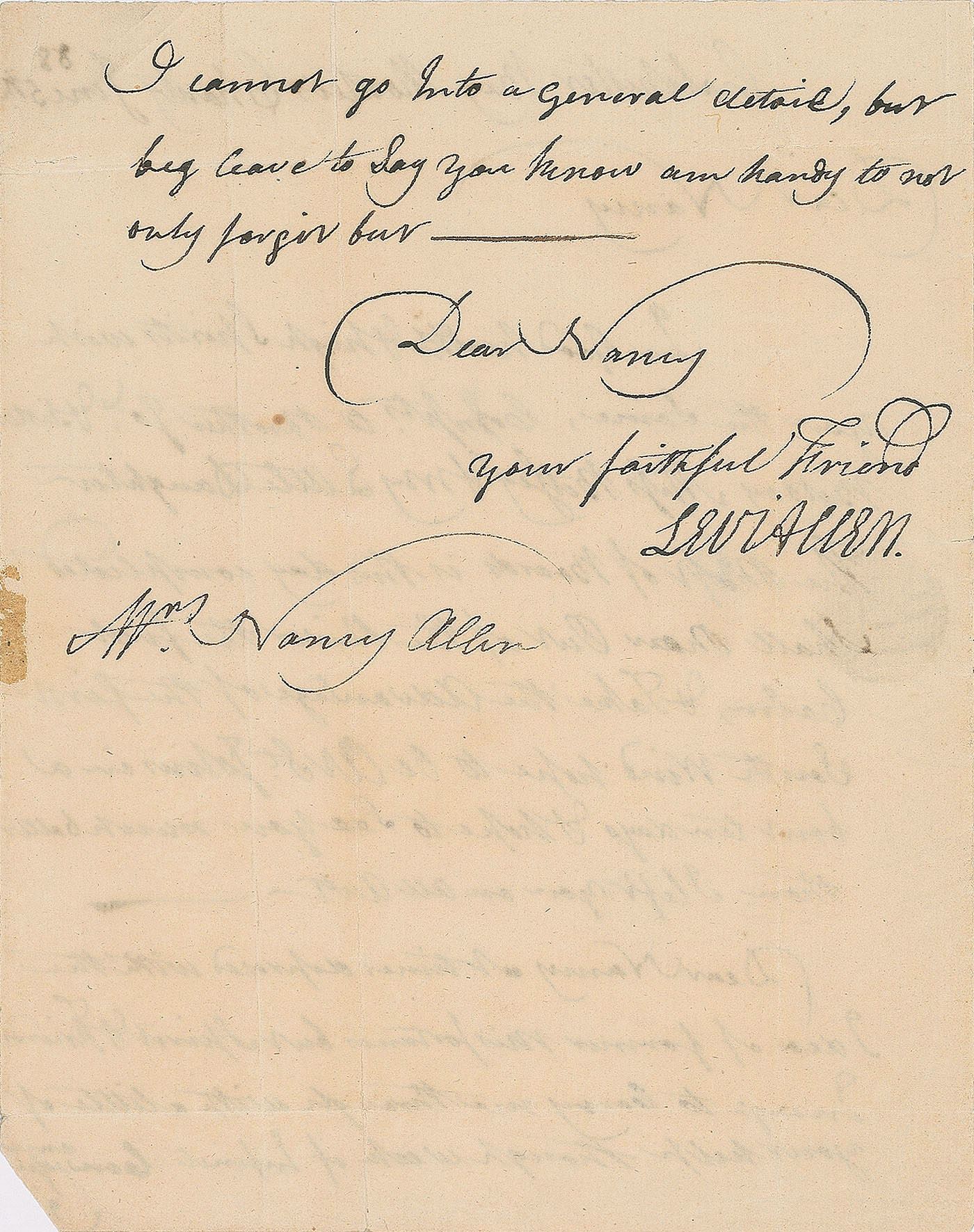 Brother (1746–1801) of legendary 'Green Mountain Boys' Ethan and Ira Allen, who remained loyal to Great Britain during the Revolutionary War. ALS, one page both sides, 6.25 x 8, June 5, 1788. Letter to his wife, Nancy Allen, written from Colchester Bay, Vermont, on Lake Champlain, where he and his brothers had organized a timber business. In part: "In Good health & high Spirits wish you the Same, Comp'ts to Brother Jos. & Sisters Betsey, Miss Betsey & My Little Daughter. The Raft of Boards is this day completed. Shall Run Out of the River the first Calm, & Take the Advantage of the first South Wind hope to be at St. Johns in about ten days & hope to see you much better than I left you on all accts. Dear Nancy at times depressed with the Idea of former misfortunes but Spirit & Friends Enough to carry me through with a little of your help." In fine condition, with a couple of seal-related stains.