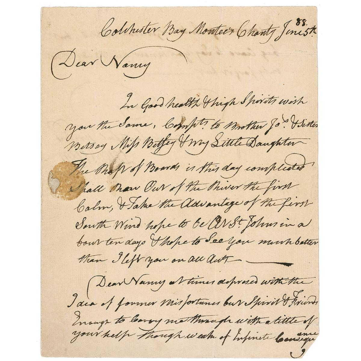 Younger brother of Ethan and older brother of Ira Allen. LS, one page both sides, 6.5 x 8, June 5, 1788. Letter to his wife Nancy. In part: “The Raft of Boards is this day completed. Shall Run Out of the River the first Calm, & Take the Advantage of the first South Wind hope to be at St. Johns in about ten days & hope to see you much better than I left you on all accts. Dear Nancy at times depressed with the Idea of former misfortunes but Spirit & Friends Enough to carry me through with a little of your help though weak of Infinite Consequence I cannot go Into a general detail, but beg leave to say you know am handy to not only forgiv but—” Second integral page bears an address panel to Allen’s wife done in another hand. In very good condition, with intersecting folds, one through a single letter of signature, adhesive remnant from seal on first page, missing lower right corner tip, a few light brushes to text, and light toning.