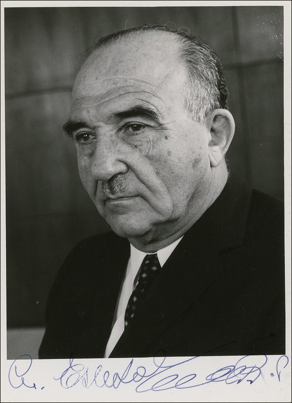 Vintage glossy 5 x 7 head-and-shoulders photo, signed in the bottom border in English and Hebrew in blue ink. In fine condition, with a few surface marks and some light irregular adhesion to signature. RRAuction COA.
