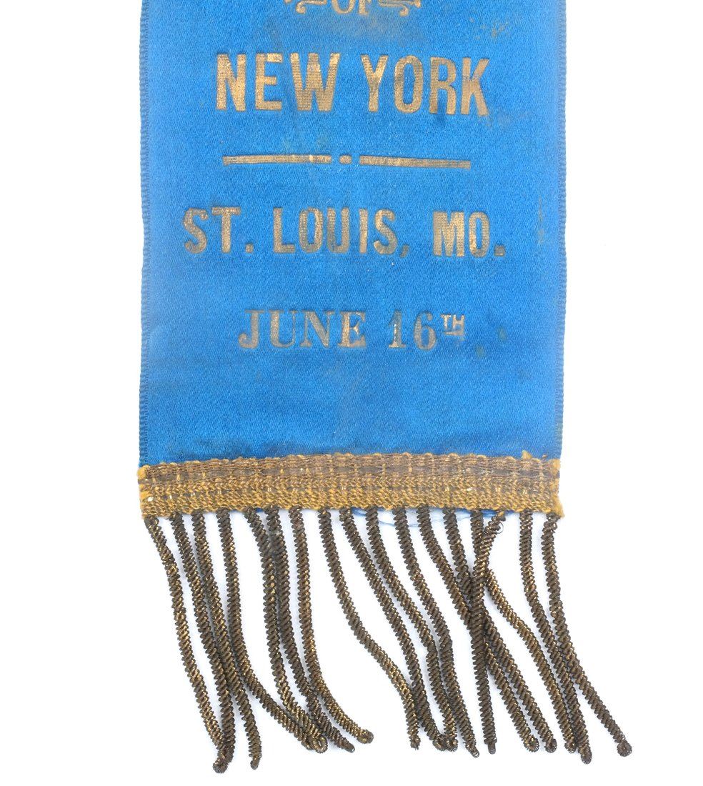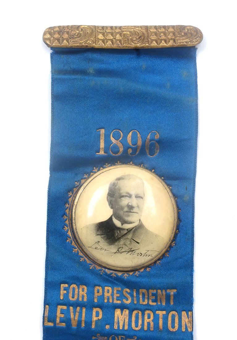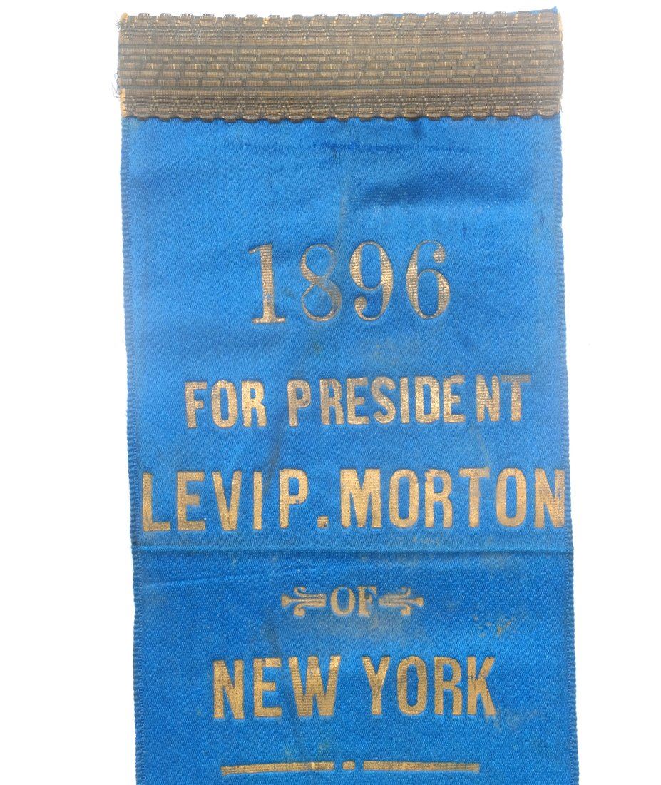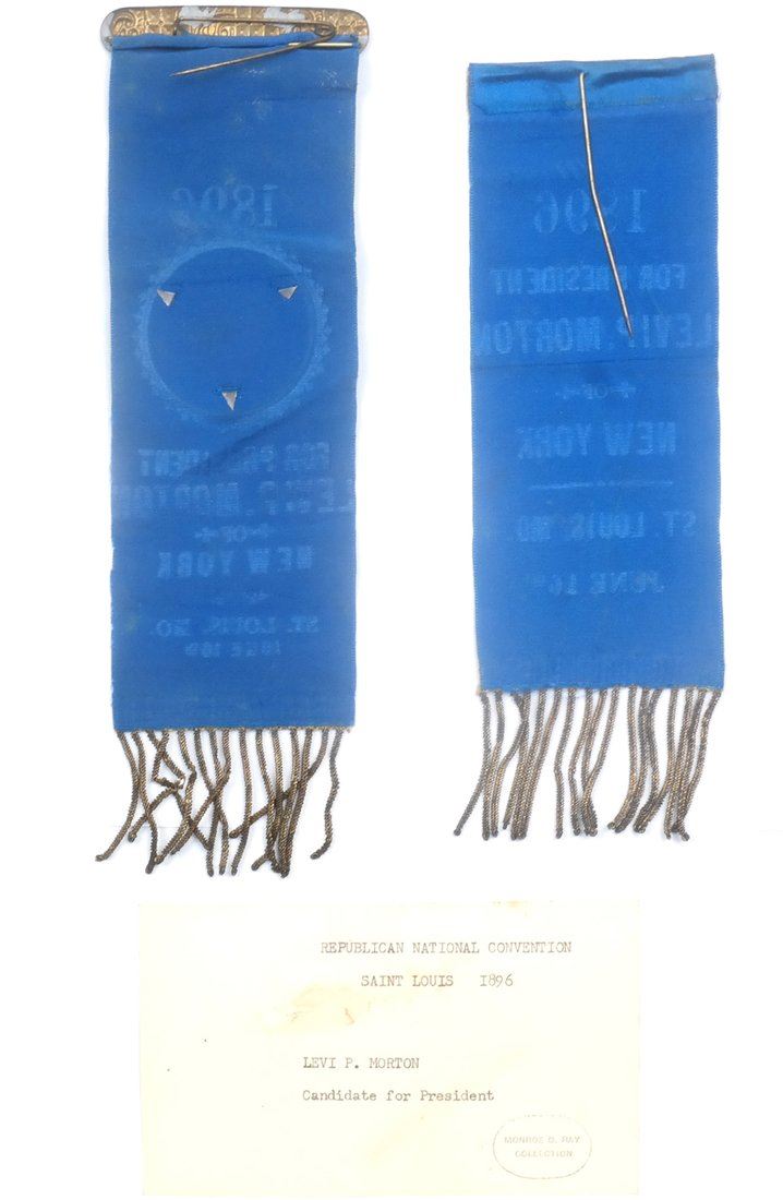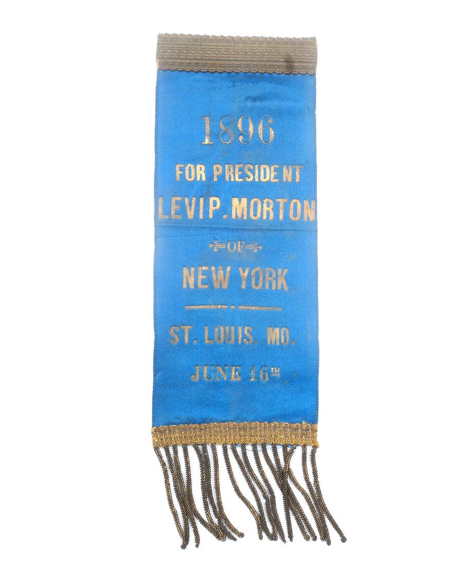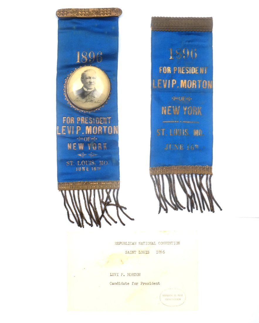 Two blue satin ribbons with gilt-stamped text for the Republican National Convention. Comprises: 1.) Ribbon with affixed circular celluloid duo-tone portrait of Morton in a bust length 3/4 profile pose. Bears applied U.S. flag bunting element at top and gold thread trim at bottom with fringe. Retains brass pin-back hanger. Text relates "1896 / For President / Levi P. Morton of New York / St. Louis Mo. June 16th." 2.) Ribbon with gold thread trim at top and at bottom with fringe. Bears same text as above item. Retains original "T" pin on verso.