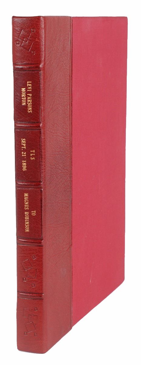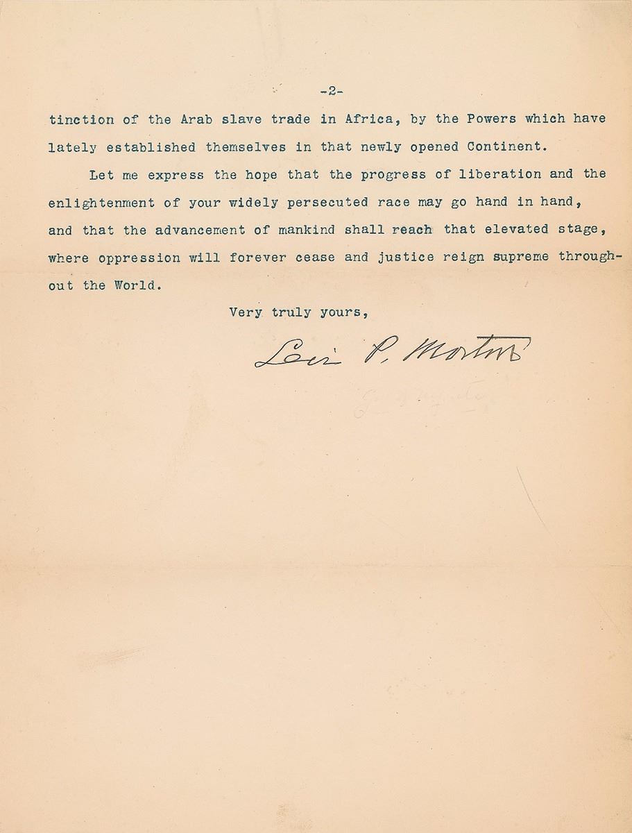 American politician who served as congressman, governor, and vice president (1824–1920). TLS, two pages, 7.75 x 10, State of New York Executive Chamber letterhead, September 21, 1895. Remarkable letter to Magnus L. Robinson, president of the National Emancipation Association, concerning the 33rd anniversary of the Emancipation Proclamation. In part: “The signing of that decree by President Lincoln was, in fact, the Magna Charta of the African race not in America alone, but practically throughout the world. At that time, African slavery existed on our own Continent only in the United States, Brazil and the Spanish Antilles. The emancipation of our slaves was followed within a few years of the Russian serfs by Alexander I, and the liberation of the bondmen, who had been held almost from the time of the Discovery, in Brazil and the remaining possessions of Spain on this Continent; and, I believe that I am not extravagant in assuming that Lincoln’s great act of manumission is, to-day, exercising at least a strong moral influence toward the extinction of the Arab slave trade in Africa. Let me express the hope that…oppression will forever cease and justice reign supreme throughout the World.” In fine condition, with light toning and soiling. Accompanied by a custom-made clamshell case. A magnificent letter with moving content at a time when the implications of the Civil War continued to reverberate around the world.
